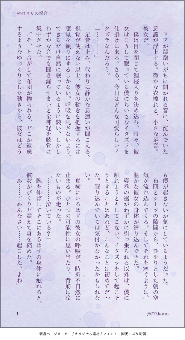 ゆかり☆quiet followDONE【やのマリ・いのマリ・七マリ】久々に悪夢を見たので腹いせに書きました。嫌な夢を見たマリィちゃんがテーマで、やのマリ・いのマリ・七マリの詰め合わせです。さらっと書いたのでさらっと読んでください。お好みのカップリングだけでもどうぞ。マリィはネームレスです。卒業後・同棲している設定です。寝室が同じだったり別室だったりします。・1~2枚目:やのマリ・3~4枚目:いのマリ・5~6枚目:七マリ show all(+5 images) Tap to full screen (size:618x1132).Repost is prohibited Let's send reactions! freqpopularsnackothersPayment processing Replies from the creator Follow creator you care about!☆quiet follow ゆかりDONEpass=2人の身長を足した合計を3ケタの半角数字で 7 ゆかりDONE【七マリ】『第二ボタンとセカンドキス』2025.03.29『# ときメモGS版ワンドロワンライ』参加させていただきました。お題は『第二ボタン』です。卒業後、七ツ森くんの実家にて。マリィはネームレス 3 ゆかりDONE【柊氷御G】『ちぐはぐ』2024.09.24https://privatter.net/p/11160008「仲良しグループのイベントのやつ」にて展示した上記の妄想の一部をSSにしてみました。カップリング要素はありません。マリィはネームレス 13 ゆかりDONE【志波主】『プレゼント』2024.07.27『# ときメモGS版ワンドロワンライ』参加させていただきました。お題は『プレゼント』です。在学中、夏の海で偶然会う2人の話。デイジーは「海野」 3 ゆかりDONE【やのマリ】『真夏日』20204.07.28在学中、夜ノ介くんのネクタイを借りるマリィの話。マリィはネームレス 3 ゆかりDONE【やのマリ】『誘惑』2024.07.25夜ノ介くんが腕時計を外す話。マリィはネームレス recommended works hatter0630DOODLE勇尾欠損(四肢截斷)尾形注意!!Password:18+?(yes/no) 2 ○みつくDONE偶像梦幻祭2 是HiMERU和天城燐音的校园pa,有蜂、二皮脸提及。连亲亲都没有所以就当是无差,但我是框公请尊重orz。带推跑路但分手饭还是写完了,我是驴。玲明追忆前的产物,刚写完一个月就给我出追忆?行,就当我遇上你万事不顺遂,码成电子版又是一年,总之拉完了。(哈哈当时许愿希望追忆别出这么快,最起码把我露水仙写完,但是他出了,hekk你在玲明的时候就该死了)分手炮晚点打,写完就痿的老毛病罢了。 8588 azuma_nandemoDOODLEナトリイトリ[晴れ着の中のインナー姿]ミニキャラでよく描くナトリ。等身高いのはこれが初描きです。 PBNIKI148085DOODLE勝手なポーランドボールBL論 2 MA17_ReDOODLEサイレン清掃会社 現行未通過❌ホーーーン Zlfi_lowDOODLE 0061219DOODLEファウフィガwebオンリー「目を合わせてもう一度」開催おめでとうございます!この日をとても楽しみにしてました!ファウストの誕生日に合わせて開催だったので、ファウストの誕生日をお祝いするフィガロのお話を描きました。少しでも楽しんでもらえたら嬉しいです!ファウスト誕生日おめでとう🥳 7 糸井🌷DOODLE #赤面する子は可愛い テンプレお借りしました NIKUmsspUMAIDOODLEクトゥルフ神話TRPG6版『ぼくらのそうさい』KP:拉麺男HO1:詫摩 潤/奈彩 様HO2:朝枝 春樹/みわ 様両生還 2