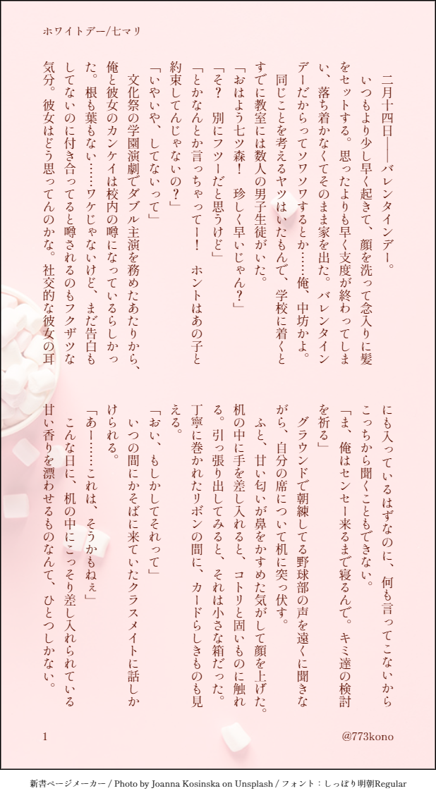 ゆかり☆quiet followDONE【七マリ】『ハッピーホワイトデー』2022.03.143年目だけチョコをもらえなかった七ツ森くんの話。マリィはネームレス show all(+7 images) Tap to full screen (size:618x1132).Repost is prohibited Let's send reactions! freqpopularsnackothersPayment processing Replies from the creator Follow creator you care about!☆quiet follow ゆかりDONEpass=2人の身長を足した合計を3ケタの半角数字で 7 ゆかりDONE【七マリ】『第二ボタンとセカンドキス』2025.03.29『# ときメモGS版ワンドロワンライ』参加させていただきました。お題は『第二ボタン』です。卒業後、七ツ森くんの実家にて。マリィはネームレス 3 ゆかりDONE【柊氷御G】『ちぐはぐ』2024.09.24https://privatter.net/p/11160008「仲良しグループのイベントのやつ」にて展示した上記の妄想の一部をSSにしてみました。カップリング要素はありません。マリィはネームレス 13 ゆかりDONE【志波主】『プレゼント』2024.07.27『# ときメモGS版ワンドロワンライ』参加させていただきました。お題は『プレゼント』です。在学中、夏の海で偶然会う2人の話。デイジーは「海野」 3 ゆかりDONE【やのマリ】『真夏日』20204.07.28在学中、夜ノ介くんのネクタイを借りるマリィの話。マリィはネームレス 3 ゆかりDONE【やのマリ】『誘惑』2024.07.25夜ノ介くんが腕時計を外す話。マリィはネームレス recommended works ざだるおんDONEノイ響えっち🔞🔞🔞過激で激しいのを求めるノイ響だよー!未成年は読まないでね 3062 保科。MOURNING未飯と黒衣時空のトラが天国でバッタリ出会って黒飯とゼノトラを見守ってるという謎設定です 7 yzkhzacDONEれいらさん【@reiraaa0112 】お誕生日おめでとうございます!!!リクエスト頂いたえっちな🍎🎸です🥕ぶちこんでもらいました💕(おまけつきです🐰)良かったらどうぞ受け取って下さい!素敵な一年になりますように✨✨pass:18over?y/n 2 nenecon2024DONEさなくの① ひじぎん工房DOODLEモフフサのスケッチ記録 6 つん助DOODLE yanDOODLE🎈⭐ 八尺大人类✖私服司避雷注意:内含🎈攻女装、体型差、奇怪颜微草稿风,接受可开 4 nnmr1111MEMO拾い画。パツパツすぎてエロ漫画か!??となった 2 三辺紗那INFOCoCシナリオ『「 」-よはく-』KP:三辺紗那/八手焔珠PL/PC:九曜さん/唐立鬼灯無事終了いたしました。そして(おそらく)関係性は進展いたしました…?!これからの春秋にご期待ください!