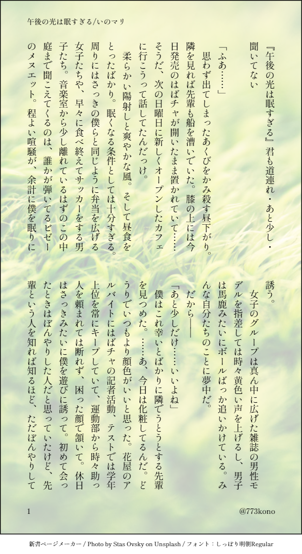 ゆかり☆quiet followDONE【いのマリ】『午後の光は眠すぎる』2022.07.3110番『午後の光は眠すぎる:君も道連れ・あと少し・聞いてない』好き~ときめき状態くらいの在学中いのマリ。一紀くんにもストレス下げイベントが発生してほしい。マリィはネームレス↓こちらのワードパレットをお借りしました。https://twitter.com/torinaxx/status/1500760360126939137 show all(+1 images) Tap to full screen (size:618x1132).Repost is prohibited Let's send reactions! freqpopularsnackothersPayment processing Replies from the creator Follow creator you care about!☆quiet follow ゆかりDONEpass=2人の身長を足した合計を3ケタの半角数字で 7 ゆかりDONE【七マリ】『第二ボタンとセカンドキス』2025.03.29『# ときメモGS版ワンドロワンライ』参加させていただきました。お題は『第二ボタン』です。卒業後、七ツ森くんの実家にて。マリィはネームレス 3 ゆかりDONE【柊氷御G】『ちぐはぐ』2024.09.24https://privatter.net/p/11160008「仲良しグループのイベントのやつ」にて展示した上記の妄想の一部をSSにしてみました。カップリング要素はありません。マリィはネームレス 13 ゆかりDONE【志波主】『プレゼント』2024.07.27『# ときメモGS版ワンドロワンライ』参加させていただきました。お題は『プレゼント』です。在学中、夏の海で偶然会う2人の話。デイジーは「海野」 3 ゆかりDONE【やのマリ】『真夏日』20204.07.28在学中、夜ノ介くんのネクタイを借りるマリィの話。マリィはネームレス 3 ゆかりDONE【やのマリ】『誘惑』2024.07.25夜ノ介くんが腕時計を外す話。マリィはネームレス recommended works ゆきちDOODLEイドラの約束現行未通過NG同卓者✖︎らくがき 44 ほいほいPAST支部にあげてる恵誕(五伏)、懐かしくなったので… 4541 くさったおにぎりって奴DOODLEちょっと息抜き〜……のハズが夜中の3時半から7時半まで入り浸ってしまった。まさか野良絵チャ(?)でここまでマリオRPG(マ□てゃん)を語り合えるとは思わなんだ〜😭⚠️マ□てゃんが可愛すぎてキショ発言してるので一応注意♡ 23 okome_daisuki5DOODLEジャクアルセックス guragura_usagiMOURNING酔った先生に襲われる👹 yuzu_iaiaMEMOCoC「LAST-0」エンドAにて終了。KPさせてもらいました✌️✌️みんなとても仲良しさんで可愛かったなぁ。長時間ありがとうございました!素敵なと話をまじかで見れて楽しかったー!☺️ 2 shogoshogo_maruINFO「英雄たちへ。」KP:やまぃもさんPL:天周 悠悟/ヨシヲさんフェイト・オイゲン/ぜんちさんエレナ・アストレア/しょごしょご丸全生還しました「私は"今"を精一杯楽しんで生きるだけです!」 蛸崎くんDOODLE初期時代。🔞。閲覧自己責任でお願いします。 hano_michirunpaDONE月詠誕生日だけどせっかく通過開始も12月だしな…と思って自陣ぬい持たせたバージョンも描いてみた