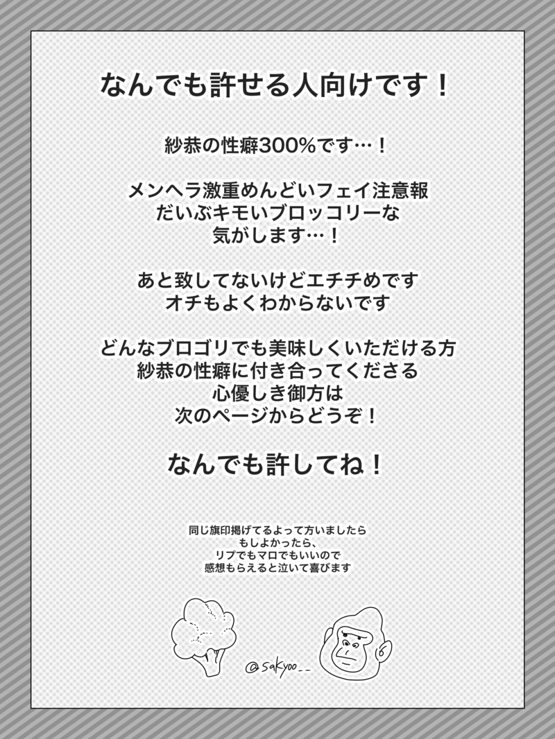 sakyo__☆quiet followDONEどこ需要かわからない激重🥦です😂 どんな🥦🦍でも許せる人向けです…先に謝まります…すみません😭こんなんでも感想あればリプかマロまで!https://marshmallow-qa.com/sakyo__?utm_medium=url_text&utm_source=promotion★ここから言い訳★初複数ページ漫画だったのですが、難しいですね😭😭精進したいです ##源藤 #ハコヅメ box-shaped show all(+8 images) Tap to full screen .Repost is prohibited Let's send reactions! freqpopularsnackothersPayment processing Replies from the creator Follow creator you care about!☆quiet follow sakyo__PROGRESSホラーパロです過去投稿した「白日夢」「幻肢痛」に三章「対消滅」パートをちょこっとだけ追加しました! 47 sakyo__DOODLEくるっぷ裏垢匿名リアクション用 sakyo__DOODLEtkbが見えているのか見えていないのかそれは山田が振り返るまで答えはわからない状態なのです。つまり、シュレディンガーのtkb。 2 sakyo__DOODLE二人は死んでも言わないと思う⚠️👨❤️💋👨パスはcp名英字4文字 sakyo__DOODLEパスワードはカプ名英字4文字みなきさ増えてほしい〜って思うようになってきた sakyo__DOODLE上裸注意 related works sakyo__DONE本誌186話ネタ含んでいるのでポイピクにあげます!今週の本誌を見て衝動で描きました😊 楽しかった 2 sakyo__DOODLE泥酔しためんどくさい強欲源 2 sakyo__DOODLE190話の落書きです!2・3枚目は私の情緒吐き出し源藤妄想です。性癖全開なのでポイピクにて🤦♀️ 3 _smms_PASTPUIPUIモルヅメ出来心でマッシュアップしたものです…🙏 4 sakyo__DONEかなり前にいただいたエアスケブ依頼です!「ゲンキハツラツ!的な聖子ちゃんが労ってくれる系のイラスト(源も一緒だと2倍嬉しい)」聖子ちゃんが最近頑張ってる依頼主さまにラーメン奢ってくれるって!(ゲンキハツラツ!感は出せなかった😭…!ごめんなさい!) _smms_PASTTwitterに上げた絵をひとまずまとめageiPad練習兼ねたオリジナル、二次含めたカラパレリクなど 12 sakyo__DOODLE猫の日アップした後に我に返った時、性癖が足りてなかった&早起きして時間が余ったので源藤らくがきです! 荒々です😂 _smms_PASTハコヅメカラー絵つめあわせ 8 _smms_PASTハコヅメ白黒ネタイラストまとめ⚠️CPネタ?および微妙にネタバレくさい(?)ラッコ鍋パロあり⚠️ 3 recommended works はなもりMOURNING「おめの世界おれの世界」の最後のページ書いたけど月いごのことを考えるほどわからなくなっていくので、ほんとに…明らかにしてほしいです(;;)本当にお願いします(土下座)月いごが気になってしょうがないですッッ~~!!!! はなもりMOURNING月島さんは、いごちゃんに自分の名前を呼んでくれることがすごくうれしかったんだと思ってます 2 はなもりMOURNINGあとがき書くのも読むのも大好きなので基本二次漫画描いたらあとがきも書くことが多いです(*´▽`*) 2 _smms_PASTハコヅメカラー絵つめあわせ 8 _smms_PASTPUIPUIモルヅメ出来心でマッシュアップしたものです…🙏 4 nmm_0416MEMO超今更、2021年10月のイラスト本の裏話的な解説。(自分用の備忘録メモでもあります)読みたい方だけひまつぶしにどうぞ!今回は「eat, sleep, volleyball, and you」のお話。 1139 mobjiro_hachiMEMO【あとがき】「島崎がマジシャンになるまでの漫画」のあとがきです。あとがきと言う名の島崎に対する叫びです。 4 sakyo__DOODLE泥酔しためんどくさい強欲源 2 mobjiro_hachiMEMO【あとがき】2022年11月12日発行「BURN HIM!」の長いあとがきです。どなたでも読める形にしていますが、本文のネタバレ全開なので閲覧は自己責任でお願いします。■11/30 少しだけ加筆修正しました。 37