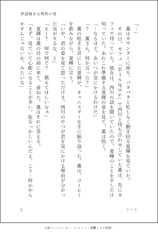 natsuki7_novel☆quiet followDONE自創作SS #小説 novel #SS show all(+3 images) Tap to full screen (size:630x928).Repost is prohibited Let's send reactions! freqpopularsnackothersPayment processing Replies from the creator Follow creator you care about!☆quiet follow natsuki7_novelDONE自創作SS 4 natsuki7_novelDONE自創作SS 4 natsuki7_novelDONE自創作SS 4 natsuki7_novelDONE自創作SS 4 natsuki7_novelDONE自創作SS 4 natsuki7_novelDONE自創作SS 4 related works ももみつDONEマターさんとクラフターさんの、日常の一コマ話。小説。 9 siro1516INFO先程お伝えした「小さな炭治郎くんと義勇さん」からのご挨拶と「お知らせ」を別で投稿です。 4 starareorangedrDONE恭龍の小説(まだつきあってない) 3 かほる(輝海)INFO平成最後にネップリ折本出します。A6サイズ8ページ。R18小説を二本収録。そのうち一つは、ここで公開済みの「路地でもっこりする二人の話」です。コードは29日の夜遅く(30日に日付が変わる頃)に支部で公開します。サンプルで1ページだけチラ見せ。よろしくお願いいたします。 zeppei27DONEなんとなく続いている主福のお話で、単品でも読めます。七夕を楽しむ二人と、夏の風物詩たちを詰め込んだお話です。神頼みができない人にも人事を超えた願いがあるのは良いですね。>前作:昔の話https://poipiku.com/271957/11735878.htmlまとめhttps://formicam.ciao.jp/novel/ror.html 3654 かほる(輝海)PROGRESSエアコミアンソロ進捗。やっと攻守交代まで来た(*´艸`*)そして、一番言わせたかったセリフまできた…あぁ満足…まだ終わらないよ(*´ω`*)肝心のセリフに字が重なってる…(´・ω・`)タップすると全部見えるようになります。 kabolove22DONESSメーカーで作った小説です。 8 siro1516TRAINING『小さな子供との夏祭り編』2/2枚 10 文月ちえり&中の人MAIKING作業進捗?みたいな感じの投稿だけど、現在Newお仕事に夢中で絶賛放置中な執筆中小説の一つ。第1章の序盤で、サイトにて公開中な10,000文字の約半分相当です。#青春 #小説 #中学生 #オリジナル#自家製本 して書籍化予定です!#文学フリマ #前橋 #東京 #文フリ 出店予定 14