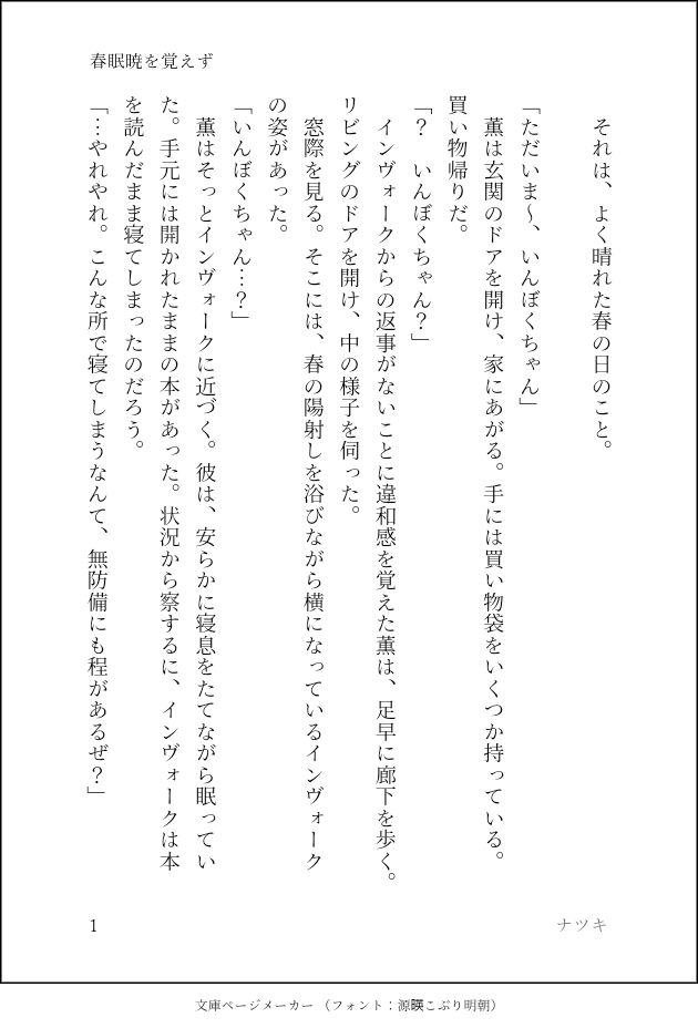 natsuki7_novel☆quiet followDONE自創作SS #小説 novel #SS show all(+3 images) Tap to full screen (size:630x928).Repost is prohibited Let's send reactions! freqpopularsnackothersPayment processing Replies from the creator Follow creator you care about!☆quiet follow natsuki7_novelDONE自創作SS 4 natsuki7_novelDONE自創作SS 4 natsuki7_novelDONE自創作SS 4 natsuki7_novelDONE自創作SS 4 natsuki7_novelDONE自創作SS 4 natsuki7_novelDONE自創作SS 4 related works fttnnDONEひなたぼっこする嶺藍(2018/3/30) ecseilogPASTわがまま弟くんとおやすみ後の秘め事 https://twitter.com/eclucifer/status/983064063293796358 3 asmDONE「獅子は狼に先制する」すけべなディミレスSS。ディミトリがユーリスに嫉妬する話。煤闇ではなく青獅子本編なので、大きなネタバレはありませんがユーリスのプロフィールに関する記述があります。 7 yuakanegumoDONE恋人ヴィク勇❄⛸こっそりと隠れて、なぜか楽しそうにスマホを眺めるようになった勇利くんに不安を覚えたがヴィクトル、最終には圧倒的にhappyになるおはなし😇🌸ヴィ「ケータイ見せて?」 1890 as_kikucho_lovTRAINING【R18】金時と士郎がひさしぶりにえっちしてるだけ※少しだけ濁点喘ぎ※結腸責め未満(経験有り) 5 haikyoIzu0207DOODLEmmntrの灰が赤部長に怪しい薬を盛るだけのほのぼのを書きました。2022年9月11日の動画(🦕プレゼンツ)を参考資料にしています。 fttnnDONE寝起きの嶺藍(2018/3/30) 風守雷矛DOODLEウェーーーイwwww(吐血)※バレンタインネタ20/2/17 月(ユエ)DOODLEゆるライで書いたもの。テーマは「風邪」ぽっせ大好きな📗が大好きです。 3 recommended works かほる(輝海)PAST獠と香を書くかほるさんには「君は気付いてくれるかな」で始まり、「世界は限りなく優しい」で終わる物語を書いて欲しいです。できれば10ツイート(1400字程度)でお願いします。https://shindanmaker.com/801664#シティーハンター #冴羽獠 #槇村香 #掌編原作レベルでも原作以降でも。1431字。ハンマーもらいながら、裏ではこんなこと思ってそう(*´ω`*) 4 kara_7250PASTnotember2019そのに。11日目〜20日目。1日目から続き物となっています。右エンドへと向かうハル相です。狩谷さんの話や政木さんのお話もあります。次の21日目でエンドを迎えます。 55 くれはDONEゾンミラSS何気ない朝が特別だったりする 2 senban11_mgDONE【小説】鳴龍組時代にこんな日があったらいいなというゆるめの妄想※画像だと読みにくい場合用に、同内容のテキスト版をこちらに載せましたhttps://privatter.net/p/8891897 6 しいかINFO【更新報告】バーラエナの骨 第10話「アズヴェルデ」公開しました 4 さくらんはお豆腐メンタルREHABILI少し甘めの中太 787 魔王様生誕記念アンソロジー本部INFOサンプル▶︎ゲスト ふじみの 様(https://www.pixiv.net/users/8219222)魔王さま中心、ほのぼの小説の寄稿をいただきました〜!! meganeuo0713ulDONEウルトラふわふわワールド1019話『ふわふわエックスのハロウィン肝試し』登場ふわふわっクス…F市W町 A家を守るふわふわ。住む家主の家は古めの日本家屋。タタミに敷いた座布団の上での昼寝をこよなく愛す。今日は新兵器4Kアクションカメラを装備し上機嫌。ふわコスモス…F寺住まいのふわふわ。とても穏やかな調子で話すが色々鋭い。 6 なかりせDONE一人一人称、K富の人間が書きましたが恋愛描写なし、診療所メンツとほのぼのが主です。ちょっと怪談チックなお話が書きたくてタグをお借りします。季節外れですが夏のお話です。恐怖・暴力描写はありません。一人先生は幽霊や魂をどのように切り分けて接することができるのだろう……。引っ張られそうになった時に踏みとどまれるのは、帰る場所・呼ぶ人がいるからってことが書きたかった。 7481