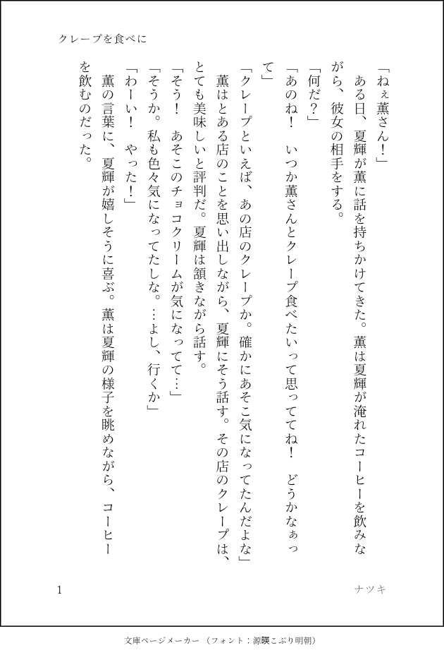 natsuki7_novel☆quiet followDONE自創作SS #小説 novel #SS show all(+3 images) Tap to full screen (size:630x928).Repost is prohibited Let's send reactions! freqpopularsnackothersPayment processing Replies from the creator Follow creator you care about!☆quiet follow natsuki7_novelDONE自創作SS 4 natsuki7_novelDONE自創作SS 4 natsuki7_novelDONE自創作SS 4 natsuki7_novelDONE自創作SS 4 natsuki7_novelDONE自創作SS 4 natsuki7_novelDONE自創作SS 4 related works ももみつDONEマターさんとクラフターさんの、日常の一コマ話。小説。 9 かほる(輝海)PROGRESSエアコミアンソロ進捗。やっと攻守交代まで来た(*´艸`*)そして、一番言わせたかったセリフまできた…あぁ満足…まだ終わらないよ(*´ω`*)肝心のセリフに字が重なってる…(´・ω・`)タップすると全部見えるようになります。 文月ちえり&中の人MAIKING作業進捗?みたいな感じの投稿だけど、現在Newお仕事に夢中で絶賛放置中な執筆中小説の一つ。第1章の序盤で、サイトにて公開中な10,000文字の約半分相当です。#青春 #小説 #中学生 #オリジナル#自家製本 して書籍化予定です!#文学フリマ #前橋 #東京 #文フリ 出店予定 14 zeppei27DONEなんとなく続いている主福のお話で、単品でも読めます。七夕を楽しむ二人と、夏の風物詩たちを詰め込んだお話です。神頼みができない人にも人事を超えた願いがあるのは良いですね。>前作:昔の話https://poipiku.com/271957/11735878.htmlまとめhttps://formicam.ciao.jp/novel/ror.html 3654 siro1516INFO先程お伝えした「小さな炭治郎くんと義勇さん」からのご挨拶と「お知らせ」を別で投稿です。 4 starareorangedrDONE恭龍の小説(まだつきあってない) 3 siro1516TRAINING『小さな子供との夏祭り編』2/2枚 10 かほる(輝海)INFO平成最後にネップリ折本出します。A6サイズ8ページ。R18小説を二本収録。そのうち一つは、ここで公開済みの「路地でもっこりする二人の話」です。コードは29日の夜遅く(30日に日付が変わる頃)に支部で公開します。サンプルで1ページだけチラ見せ。よろしくお願いいたします。 kabolove22DONESSメーカーで作った小説です。 8 recommended works かほる(輝海)DONEシティーハンター冴羽獠×槇村香原作以上の関係新聞でとある記事を読んだら、急に滾ってきた(*´ω`*)いくつになっても手をつなげる人がいるってのは幸せだよね。 2364 ohiya_15MOURNINGこんな現パロ留伊♀いかがでしょう👐私は好き☺️(需要あれば清書しようかなって思っていたりなり……) 2 いりこDONEつづきました やっぱりいちゃいちゃしてるだけ桐島(受)は猫っぽい 須永(攻)は犬っぽい 1933 りんぶるDONEミトスが深夜の森でティトレイを見つける話。4部イメージ 18 oyadoriDONE簡単なカードゲームでも手を抜かない二人な銀博♂SSです〜!🥰🏔読了後なので、もう自分の解釈に自信を持っていきます💪 4 鯉登陽PROGRESS屈強な男がもっと屈強な男にメチャクチャ犯されまくるだけのおはなし、チョイ見せ。完成版はムーンとピクシブに上げますヨロシクね 3975 かほる(輝海)DONEシティーハンター冴羽獠×槇村香月見をする獠の独白 951 tomiya_misa_00INFO2023年5月4日に発行予定の『Dear Virusジョルブ再録集』の全体サンプルです!ちょっと見にくいかも…。ページは飛び飛び。だいたい濡れ場のシーンをチョイスしてます。濡れ場の最中もあれば、冒頭とか、まあ…なんかあれです。(あれってなに)表紙込み520ページ、イベント会場価格2000円予定です。 6 GOMI7188DONE 2626