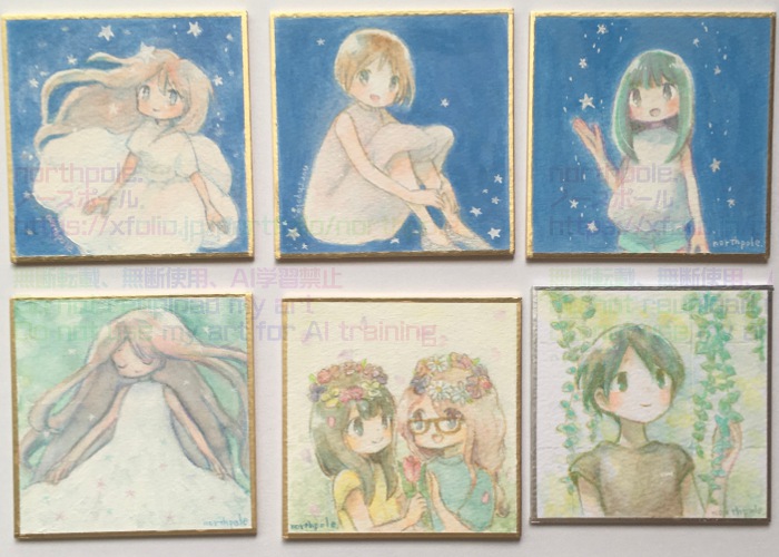 水彩、色鉛筆、アクリルガッシュ、パルプベースなどを使いました。一枚は少し前に描いたものに加筆しました。