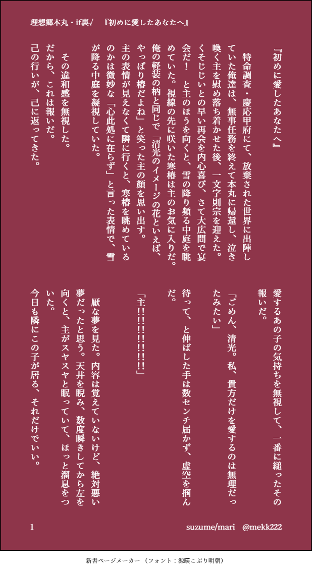 mekk222☆quiet followMAIKING理想郷本丸if裏√ 『初めに愛したあなたへ』 show all(+8 images) Tap to full screen (size:618x1132).Repost is prohibited Let's send reactions! freqpopularsnackothersPayment processing Replies from the creator Follow creator you care about!☆quiet follow mekk222SPOILER20250123我が本丸回想回収156〜166丙子椒林剣・九鬼正宗・雲生・道誉一文字辺りの回想を回収してきました! 3542 mekk222DONE #百香七紫至城十周年 1~6日目包丁 清光 安定 青江 則宗 南泉 12 mekk222PAST我が本丸 長義さに 長義×主見れば見るほど熱くなる視線 2 mekk222PASTエゴ・ヴェラキッカ 4 mekk222PAST理想郷本丸 清光 周年/if喪服/二振目※改変あり 5 mekk222PAST理想郷本丸+兄弟本丸(糸見姉弟) 4 recommended works ItokirimaruDOODLEなんか殴られたジャくん見にくいしパスはずしたよ mekk222DONE #百香七紫至城十周年 1~6日目包丁 清光 安定 青江 則宗 南泉 12 111miyukiDONEへび年勇尾ちゃん漫画すけべを足しました(笑)まさに蛇足ですが。今年もよろしくお願いします♡ 3 rinestrrDOODLEThe Herta <3 Mx_Merfolk_cosDOODLE前に投稿した、年越しエッッッしたい兄上の続編(現パロ) 2 otaota_huhuDONEモブis第二弾だいぶ無理矢理 断l面l図?ボlテl腹?あります↑18?(y/n) jmilytm95DOODLE mqube015DOODLEあけましておめでとうございまする、今年も快調な会長 kijinDONEデミアイ姫初め。デミちゃんから手出すの難しいから御身誘い受けがデフォになってしまう。スパダリ受けや…スパダリやけど中身可愛いのに…。