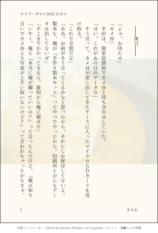 maru_o_ks☆quiet followPAST半ロナクリスマス話の後日談。半とカメ。本編はぷらいべったーにあります。2022.12.29 ツイッター投稿 show all(+1 images) Tap to full screen (size:630x928).Repost is prohibited Let's send reactions! freqpopularsnackothersPayment processing Replies from the creator Follow creator you care about!☆quiet follow maru_o_ksPASTホリデー半ロナ2023の企画に寄せて書いたもの。こっちに上げ忘れてたのをふと思い出したので 3 maru_o_ksPAST290死を読んで書いた話。仕事中にロナ補給する半。2022.5.21 ツイッター投稿 3 maru_o_ksPASTハロウィン話その後。2022.10.27 ツイッター投稿 4 maru_o_ksPAST半ロナハロウィン企画で書いたお話。2022.10.27 ツイッター投稿 6 maru_o_ksPAST半ロナクリスマス話の後日談。半とカメ。本編はぷらいべったーにあります。2022.12.29 ツイッター投稿 2 maru_o_ksPAST入学式翌日の半とロナとカメの話半視点2023.3.1 ツイッター投稿 6