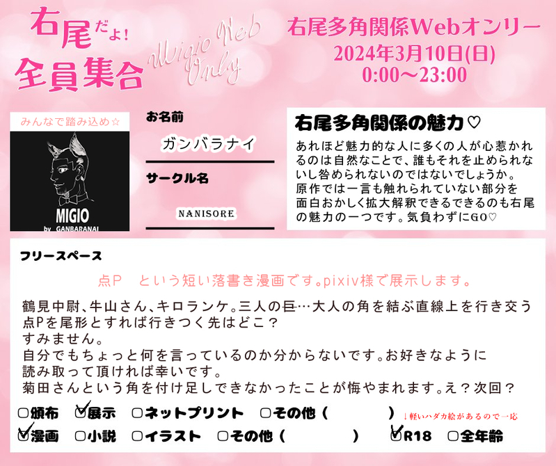 gkm_hicco☆quiet followMENU右尾多角関係Webオンリー「右尾だよ!全員集合」サークル参加者様のお品書きです show all(+20 images) Tap to full screen (size:940x788).Repost is prohibited Let's send reactions! freqpopularsnackothersPayment processing Replies from the creator Follow creator you care about!☆quiet follow gkm_hiccoINFO菊尾Webオンリーカウントダウン記念イラストです。※一部肌色多めの表現があります。イラスト提供者様(掲載順)これきよ様どろぼ様おお沼様檸檬茶様ぱん様かかを様AR様椿様えむのすけ様きょっちゃん様つらら様めん様 12 gkm_hiccoMENU菊尾Webオンリー参加者様サークル参加お品書き 7 gkm_hiccoINFOCRAZY TRAIN天然水もちさん(@10nenmizumochi)に頂いたえっちな表紙です!18↑? 2 gkm_hiccoDONE菊尾の日!ということで勇尾前提の菊尾です。勇作さんの葬式の日に菊田に抱かれる尾形です。18↑? 3514 gkm_hiccoMENU右尾多角関係Webオンリー「右尾だよ!全員集合」サークル参加者様のお品書きです 21 gkm_hiccoINFO🎉サンプル公開ラスト🎉3月17日頒布予定 右尾3Pをテーマにしたアンソロジー「MIGIOX!」のサンプルを公開いたします!天然水もちさん(@10nenmizumochi) 白+杉×尾ひーこ(@gkm_hicco) 杉+菊×尾ぱんさん(@The7thBread) 杉+菊x尾18↑? 5 recommended works ymzknlDOODLEバレンタイン(降志)4 14 satteichnansanDONE暑くて熱くて棘境/ソンエリ暑すぎるあまり氷で遊びながらえっちし始める二人のお話です。※氷フェラ、中に氷を入れるなどの描写※5月5日スパコミにて配布した無配と同じ内容です 6 AmiakleintDOODLE键垩女铜,女巫扣修女 3 so/soka_@落書きメインDOODLEさよならさけひよ 丁寧に丁寧に見ようと思ってみました。面白かったです。ありがとうございます。 Tubo_is_AsaiDOODLE❚ℂ𝕒𝕝𝕝 𝕠𝕗 ℂ𝕥𝕙𝕦𝕝𝕙𝕦【 桐と枸櫞 】 ――――――END 1両生還!*「GODARCA」現代コンバート*KP / KPC ‣ らいる さん / 小鳥遊 燐PL / PC ‣ つぼあさ / 舞鶴 ミレ ClvX8BGbULmeRuRMEMO2024/12/21 ァュ(59右)PAST飯空 itodoyukashiSPOILERトルチェ・デ・キッチュ! 現行未通過❌️fa💘 グタペルカDONE冬 5