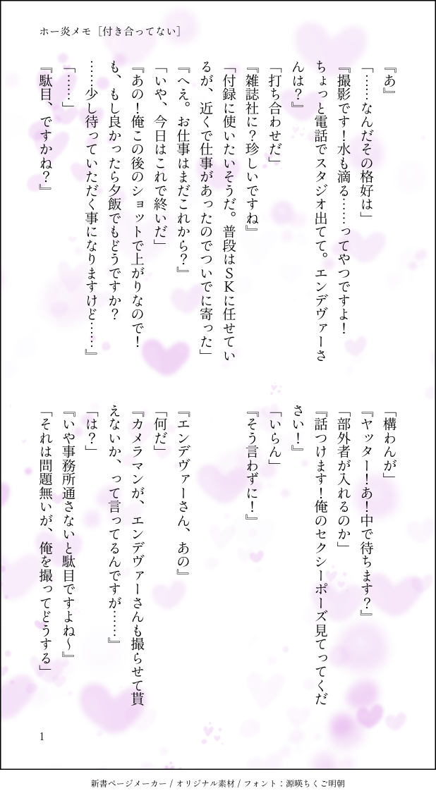 yuuki_1132☆quiet followDONE【付き合ってない】ホー炎🦅🔥ネタメモ(SSメーカー)(会話文) #ホー炎 hoFlame ##ホー炎 show all(+10 images) Tap to full screen (size:618x1132).Repost is prohibited Let's send reactions! freqpopularsnackothersPayment processing Replies from the creator Follow creator you care about!☆quiet follow yuuki_1132PAST2023年春〜の絵(企画告知含む)⭐️2024.12~2025.7の絵を追加。一枚だけ上半身のみの行為中の絵あり。 27 yuuki_1132PROGRESS⭐️18歳以上(高卒相当)の方のみ。18 years of age or older (equivalent to a high school graduate)⭐️yes/no七誕の話(2年目)の続き。前回→https://poipiku.com/472572/9013476.html下描き+トーン。2025.7.20 1頁追加。 9 yuuki_1132MEMOただのメモ(ほぼ会話)。心情描写とかは無い。 3278 yuuki_1132MAIKINGお風呂漫画(https://poipiku.com/472572/9135790.html)の別ver.18歳以上の方のみご覧ください。(y/n) 5 yuuki_1132DONE15歳以上ですか?(y/n)※R18漫画のR15編集ver.です。 3 yuuki_1132MEMOSさんの⚯くん関連ツイの『…自分にも垂れてるイメージ…』の誤字(正:持たれてる)を見た時に脳裏をよぎった趣味の絵です。2023.8.14 コマ追加して清書しました。18歳以上(y/n) 3 related works はるとPROGRESS炎さんのエロ顔難しすぎ問題hrak ホー炎原稿進捗※一応R18にしてます ろく。DOODLE足閉じ寝バックが描きたかったらくがきです 深夜ラーメンCAN’T MAKEなんも出てないしぬるいけど入ってるので一応18指定ホー炎エロ漫画初めて描いた……難しい まるじゃぶDONE万事何事もつつがなく終わってお付き合いしているホー炎がタッグを組んで事件を解決に導かない話 3 まるじゃぶDONE思ってない事は酒が入っても言わない 3 rakihoenTRAININGホー炎R18涙に関するよこしま漫画 3 oosima2120DOODLE色塗った soup394DONE『欲張りさん』ホー炎どっちもどっちな欲張りさん二人 49send_CAN’T MAKE初のエチ絵(ものは出てません)背後注意⚠️ recommended works ふわふわの犬DOODLE色収差大好き きょろDOODLE好きなように追加※3枚目単行本11巻ネタバレ注意 3 銀DOODLEしゃけ!しゃけ!! rosut_82DONEじゅじゅさんぽ。3人でたまたま似たような系統の色の服で揃って「マジか」って言いつつ出かけてほしい。ぜったいかわいい…。 2 takaba03DONE12/16 真人と順平 シバチャンDOODLEイケメン描くのむずいて たづTRAINING呪術女子 yo!TRAINING元気そうで何よりー!って顔 AKSchizDOODLEアカウント引越し用まとめらくがき 44