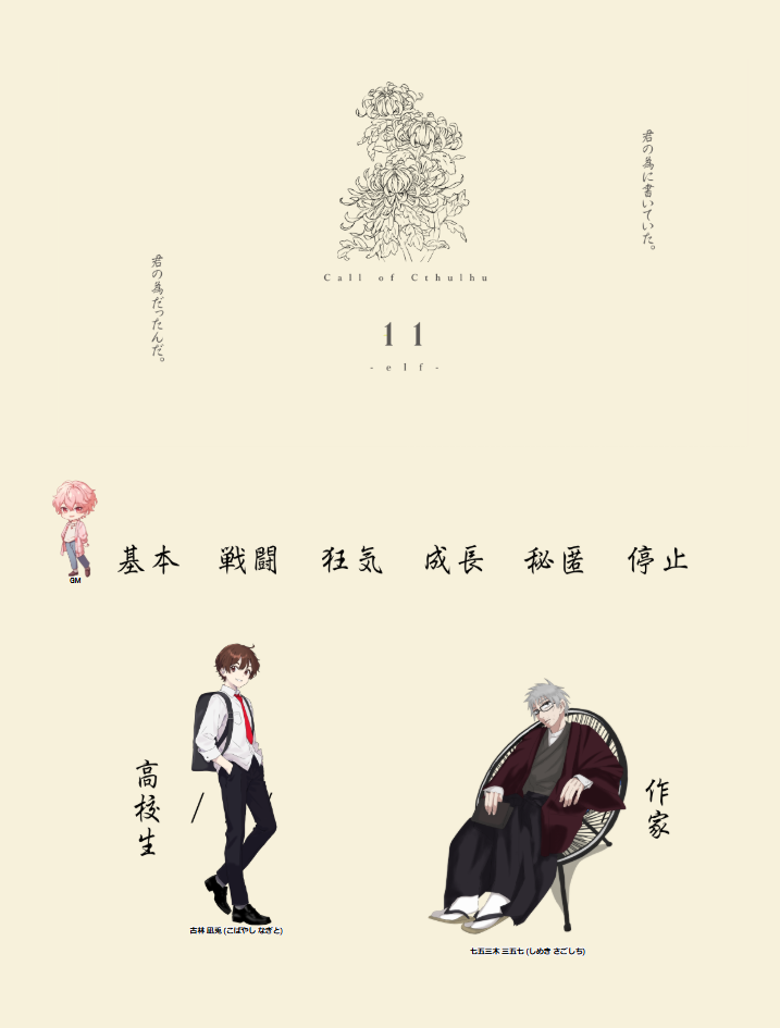 bloom_etk☆quiet followDONECoC TRPG「11-elf-」KP:ルサルカさんPL/PCHO1:bloom/古林凪兎HO2:壱夏さん/七五三木三五七ED:10 #TRPG #通過報告 passTheReport Tap to full screen (size:717x945).Repost is prohibited Let's send reactions! freqpopularsnackothersPayment processing Replies from the creator Follow creator you care about!☆quiet follow bloom_etkDONECoC TRPG「Lustig Partner」KP:bloomSKP:すこちゃんPC/PLHO探偵:写楽彫栖 / すしさんHO助手:加賀地ナギ / きけすいあさんEnd1 両生還 bloom_etkDONECoC TRPG「ASTRO CODA」KP:だいしさんPC/PL九条 真昼/くるすさん桜田 恵利菜/柚木さんSerena・Miller/bloomEND:D 全ロスト bloom_etkDONE|| CoC TRPG|| ASTRO CODA|| ASTRO CODAは揺るがない。 だが、答えを導くのは君たちだ。 bloom_etkDONECoC TRPG「ツインレイの悲劇」KP:bloomPL/PCHO Detective:くるすさん/アリア・H・ウィリアムズHO Professr:柚木/ヴィクター・フォン・プロフェンスキーエンド:A bloom_etkDONECoC TRPG「東京四凶」KP:壱夏さんPL:HOコマイヌ:サリさんHOヤタガラス:センさんHOサンザル:bloomHOシロヘビ:ルサルカさん bloom_etkDONE|| CoC TRPG|| ドッペルゲンガーの証跡|| HO3 THESEUS 「貴方は果たして貴方なのか」 related works bloom_etkDONE2024年 No.29CoC TRPG「ACTOR:0」KP:さささんPL:ルサルカさん、くるすさん、bloom、柚木(HO順) ameneko_299INFOプルガトリウムの夜 4陣エンディングF oinaTRPGDONE𝗖𝗼𝗖『累卵』𝗞𝗣:温田𝗛𝗢刀:千羽透衣 / 織部𝗛𝗢魔:桜狐 / おいな*ꜱᴘᴇᴄɪᴀʟ ᴛʜᴀɴᴋꜱ-よふかし║𝗘𝗡𝗗-𝟰 みかのはINFO10/24.25CoC6th「やさしい世界と呼吸法」KP/KPC:みかのは/鐘城帆乃果PL/PC:もりおさん/皇 要二人らしすぎて・・・(´;ω;`)大好きでした。ありがとう。 みかのはINFOCoC6th 「やさしい世界と呼吸法」KP/KPC:みかのは/佐久間 桜音羽PL/PC:flamingoさん/浜辺蘭海碧海の継続。久しぶりの二人、楽しかった~~!!初回しさせてくれてありがとう♪ みかのはINFO10/29「メルティー・シュガー・ハロウィン」KP/KPC:みかのは/牧 優佑音PL/PC:りんごさん/早瀬 凛初恋性の継続で!!かわいかった・・・(*´ω`*)この二人好きだ~~!! bloom_etkDONECoC TRPGヤドリギあやかし探偵社キャンペーンシナリオ全四話KP:bloomPLHO鬼:TheodoreさんHO蛇:🔥👑🐟🐻ちゃんHO狐:のと柳さんHO蜘蛛:すしさん全生還 全話踏破 5 みかのはINFO12/6CoC6th「雨上がりに君と。」KP/KPC:もりおさん/杉下 礼PL/PC:みかのは/レイラ・アスター綺麗なシナリオでした!!好きだったなあ・・・ああああって思うことはあるけど笑この二人、どうやって発展するんだろうなあって予測できないかも!楽しみです♪ みかのはINFO11/11.12.15.19CoC7th「5W1H」KP:ほくろさんPL/PCあん音さん/日暮 梓すずさん/逢笠 菜乃花みかのは/月嶋 雛菊このシナリオ・・・本当に大好きだった。RPのやり取りが最高すぎた・・・楽しすぎた。みんな大好き。記憶消してもう一度回りたいシナリオリストに入りました。7版のKPしたことないけど、これはしてみたいと心からおもいました。感謝!!!