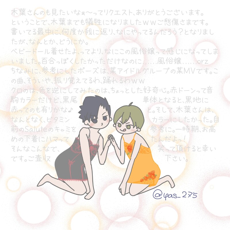 yas_275☆quiet followDONE⚠女装注意こないだ、クロのベビードールを書いたら、木葉さんのも見たいとリクエストを頂いたので、書いてみたよ。笑ってもらえたら、なにより。いつもの通り、文字は読まなくて問題ないです。 Tap to full screen (size:2756x2756).Repost is prohibited Let's send reactions! freqpopularsnackothersPayment processing Replies from the creator Follow creator you care about!☆quiet follow yas_275DONE⚠女装注意こないだ、クロのベビードールを書いたら、木葉さんのも見たいとリクエストを頂いたので、書いてみたよ。笑ってもらえたら、なにより。いつもの通り、文字は読まなくて問題ないです。 yas_275DONEリクエストを頂いた、ベビードールな🐈⬛。女装注意笑ってもらえたら、なにより。いつもの通り、文字は読まなくて問題ないです。 yas_275MEMO赤このの、ピアニスト🟥×調律師🍂のパロ「Je te veux」の裏話です。書ききれなかったこととか、ダラダラと独り言 1819 yas_275MOURNING赤このの、ピアニスト🟥×調律師🍂のパロ書きました。企画のお題をお借りしました。https://x.com/paich_hq0507/status/1929181177916625345某少女漫画の影響受けまくりだし、先に尊敬する字書きさんがこの題材で書かれたしなので、こっそり。と、画像であげたのあるけど、読みにくいだろうから、テキスト版もあげとく。 5334 yas_275MOURNING赤このの、ピアニスト🟥×調律師🍂のパロです。企画のお題をお借りしました。https://x.com/paich_hq0507/status/1929181177916625345某少女漫画の影響受けまくりだし、先に尊敬する字書きさんがこの題材で書かれたしなので、こっそり。多めに見て下さい。テキストのままの方が読みやすいだろうけど、最後のページを独立させたかったので画像で失敬。 8 yas_275CAN’T MAKE相互さんのお誕生日お祝いのsumata。兎赤のつもり。成人済?(yes / no) recommended works nnym_blackstarREHABILIR/E/D見てて思いついた、敵対するスパイ同士の恋的なやつをジェイドで。書きたいとこだけ書いてみたけど、ほんとにこういうのがっつり読んでみたい。 1909 ロクチャーヌMEMO落書きとラフ練りを時間制限でやったうちよそ大集合創作、版権ごちゃごちゃだしパロ要素がある 3 樂基水水DOODLE🧜♂️悠仁人魚🧜♂️ ren_ta11DONE怪盗🐺❄️(怪盗ばじ×監禁少年ちふゆのばじふゆ) 7206 yanamaya FAPASTたまになんで誘ったのかという考察したりはする。※某本の表紙パロ komorin1342DOODLE思い付き號翔プロポーズ漫画清書するかは微妙なのでここに投げるだけ投げておきます 3 金も時間もないDOODLE電波人間まとめ②(NEW)やっっっっと始めた 超楽しい書いたら増える 3 ahyuck_DOODLEデフォルメ絵だけど、バニーガール👯♀️なすぎくん。隠したいとこ多すぎて手が足りない💦みたいな! saida__man5SPOILER催眠ダーリンLv.1♡ トゴスマ 現行未通過×抜粋ログ小説。R18。トゴスマ継続。 6