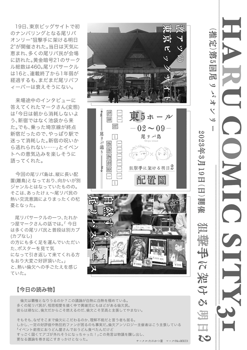 ¥2023年3月19日(日)開催の春コミ尾リパオンリーのイベントレポ?っぽいものの記事です。