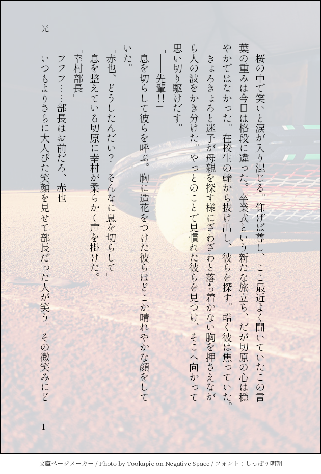 やすけ@さくらうさぎ御殿☆quiet followDONEテニプリ 立海の卒業式の話。2015年くらいに書いた作品。 #テニプリ tenipuri #立海 rikai show all(+5 images) Tap to full screen (size:630x928).Repost is prohibited Let's send reactions! freqpopularsnackothersPayment processing Replies from the creator Follow creator you care about!☆quiet follow やすけ@さくらうさぎ御殿DOODLEペルソナ3 真ハムデフォの「琴音」に着目してうまれたはなし。 9 やすけ@さくらうさぎ御殿DOODLEペルソナ3 真ハム 天田くんに嫉妬する真田先輩 6 やすけ@さくらうさぎ御殿DOODLEペルソナ3 真ハム書きたかったです。 8 やすけ@さくらうさぎ御殿SPOILER今書いている真田先輩の中編?です。こんな感じのお話を書いてます。完結させたいですって決意表明。私は普段、恋に踊らされる真田先輩ばっかり書いてます。本来、真田先輩はそういう人じゃないって思う方もいると思いますが、恋愛を抜きにした描写は原作が十分にやってます。なので私があえて書く必要は無い、私は恋に翻弄される真田先輩を膨らませて書きます。私が見たいんです。 やすけ@さくらうさぎ御殿DOODLEペルソナ3 真ハム最後のイラストはトレスです。普段イラストは描かないです。描けないので。でもこのお話のシーンを描いたからですね…… 9 やすけ@さくらうさぎ御殿DOODLEペルソナ3 真ハム 七夕マッチ 真田先輩視点 4 related works 匿名さんTRAININGリョーガとカズヤカズヤがリョガを押し倒している図ではありません(一応) 谷DONE好きなものと好きなもの軽率に合わせる 星ノDOODLE 匿名さんDOODLE種ヶ島先輩最近らくがきみたいなのしかしてないや 谷PAST割とお気に入り 2 じんこ(じ)DOODLE #テニプリ #忍足侑士 he_tanNerdDONE🎾絵茶に参加させて頂きました☺️ありがとうございました✨ 2 砧しうかPASTテニスまとめ#テニプリ#テニスの王子様 27 匿名さんTRAINING