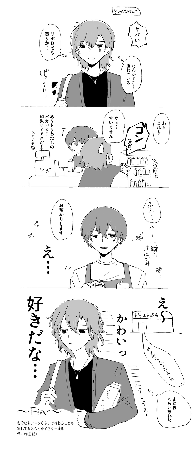 別に特別なやりとりでも何でもないのに、若い女性がなんとなく笑ってくれたことが疲れに沁みてしまい、ウワ!キモオジ思考になってる…怖…となった。相手が自分より若いことで謎の労われている感(※認知バイアス)が出るのかな〜もう接客業は廃止して…AIにやらせよう…閉廷