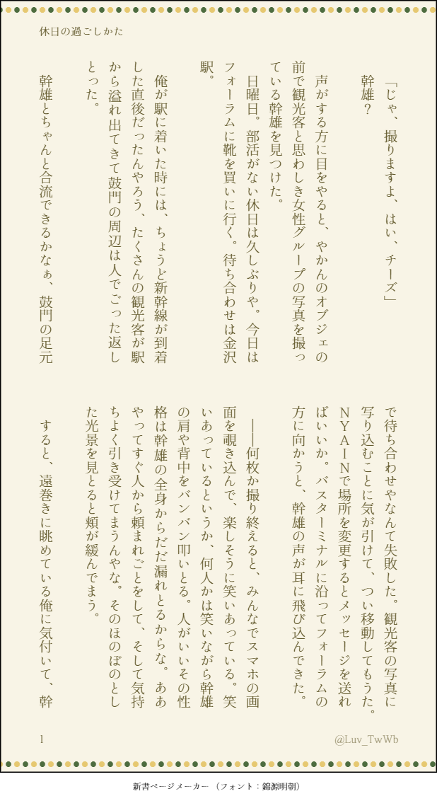 うきる☆quiet followDONEほんのり茜幹 SS休日の過ごしかた 【ビズログ12月号の生徒調査票:幹雄くん回答から幕間妄想】ぬるい。カップル未満。一応 あかみき・茜幹カップルというより、ただの仲の良い友達方言捏造 色々捏造https://twitter.com/Luv_TwWb/status/1608416164392370176?s=20&t=8tceZOA1RC8U62Grix09bA ##wb!幕間妄想 ##微腐 show all(+3 images) Tap to full screen (size:618x1132).Repost is prohibited Let's send reactions! freqpopularsnackothersPayment processing Replies from the creator Follow creator you care about!☆quiet follow うきるDONE大かきぞめイベ ストバレ十希くんと愛実さんいくみのツンデレ引き分け~大将戦の間の幕間妄想ストにアニキが居なかったから、つい……(エヘ)余裕ができたら加筆修正したい初出:https://twitter.com/Luv_TwWb/status/1613183141354831874?s=20&t=8tceZOA1RC8U62Grix09bA 3 うきるDONEほんのり茜幹 SS休日の過ごしかた 【ビズログ12月号の生徒調査票:幹雄くん回答から幕間妄想】ぬるい。カップル未満。一応 あかみき・茜幹カップルというより、ただの仲の良い友達方言捏造 色々捏造https://twitter.com/Luv_TwWb/status/1608416164392370176?s=20&t=8tceZOA1RC8U62Grix09bA 4 うきるDONE体育祭SS wb!幕間妄想【蘇岳と蒼斗の筋トレの話】体育祭蘇岳カドストアナザーまでバレ※くっつりや営業時間、店内のあれこれ 捏造<初出>https://twitter.com/Luv_TwWb/status/1579482502548574209?s=20&t=3O_wNm-juJ_j98xGhPY0vQ 7 うきるDONE茜幹 文化祭SS wb!幕間妄想(腐)【茜カドストアナザーで幹雄が動画撮ってた…だと?】文化祭イベスト/文化祭茜カドスト バレあり茜幹方言捏造<初出>https://twitter.com/Luv_TwWb/status/1574049605611683840?s=20&t=3O_wNm-juJ_j98xGhPY0vQ 5 うきるDONE初創作 夏祭りSS wb!幕間妄想 22/8/6upに加筆修正【純太。あの後、金魚どうしたん?】【幹雄と玲音 二人きりの時の会話を妄想したかった】夏祭りイベストバレありCP左右明言なし/ほんのり→光玲・茜幹・十愛方言捏造 6