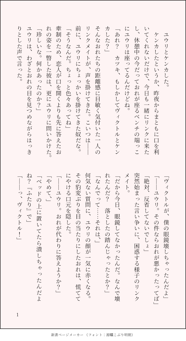 yuakanegumo☆quiet followINFO勇利くんの眼鏡が壊れた理由といつも通りモブを牽制するヴィクトル show all(+1 images) Tap to full screen (size:618x1132).Repost is prohibited Let's send reactions! freqpopularsnackothersPayment processing Replies from the creator Follow creator you care about!☆quiet follow yuakanegumoPROGRESS装丁家ヴィクトル✕小説家勇利くんのヴィク勇です。謎の人気装丁作家ヴィクトルが、駆け出しホラー小説家の勇利くんのもとに取材旅行を理由に勝手に押しかけて来日し、「カワハギさん」というオリジナル都市伝説をめぐる事件に巻き込まされていくラブコメ事件もの(?)です。リクエストいただいたネタをもとに作成いたしました。ありがとうございます! 16015 yuakanegumoPROGRESS恋人ヴィク勇。「セッ…中のユウリは可愛い」と主張するヴィクトルに納得いかない勇利くんが、なりゆきでヴィクトルと「ハ〇撮り」セッ…をしてしまういちゃいちゃヴィク勇です。まだ中盤ですが、完成したら支部にUPしたいと思います。マシュマロから頂きましたお題で書かせて頂きました🥰ありがとうございました! 3500 yuakanegumoPROGRESSラット事件以降、優しすぎるセッ…をするようになったヴィクトルに対して、「嫌われたかもしれない」と不安を抱いてしまった勇利くんが、いつも通り暴走するけど最終的に恋人として幸せなSMセッ…をする「Overdose」番外編 サンプルです。未公開部分は、あと半分くらいです(ざっくり計算ですが…)同人誌頒布の際、書き下ろしとして加筆修正の上、収録予定です。 14262 yuakanegumoPROGRESS番設定のオメガバヴィク勇❄⛸勇利くんと番になった影響で初めてラット(αのヒート)を起こしてしまったヴィクトルが、ヒートに向けて巣作りの準備をしていた勇利くんを手加減なしに抱いてしまうお話です。【作業進捗】 17612 yuakanegumoDONE恋人ヴィク勇。「セッ…中のユウリは可愛い」と主張するヴィクトルに納得いかない勇利くんが、なりゆきで録画セッ…するまでのイチャイチャSS😌🙏ちょっとソフトSМちっくなR18Verを、後日追加予定です。マシュマロから頂きましたお題で書かせて頂きました🥰ありがとうございました! 3553 yuakanegumoPROGRESSちょっとしたきっかけで、勇利くんのこと散々いじめてしまうヴィクトルのお話です。文章は修正はいります。拘束あり。 723