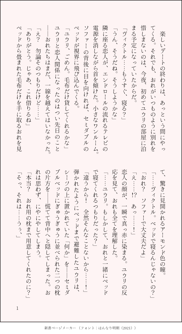 yuakanegumo☆quiet followINFOお泊りデートにうきうきしてる勇利くんと我慢するヴィクトルの話 show all(+1 images) Tap to full screen (size:618x1132).Repost is prohibited Let's send reactions! freqpopularsnackothersPayment processing Replies from the creator Follow creator you care about!☆quiet follow yuakanegumoPROGRESS装丁家ヴィクトル✕小説家勇利くんのヴィク勇です。謎の人気装丁作家ヴィクトルが、駆け出しホラー小説家の勇利くんのもとに取材旅行を理由に勝手に押しかけて来日し、「カワハギさん」というオリジナル都市伝説をめぐる事件に巻き込まされていくラブコメ事件もの(?)です。リクエストいただいたネタをもとに作成いたしました。ありがとうございます! 16015 yuakanegumoPROGRESS恋人ヴィク勇。「セッ…中のユウリは可愛い」と主張するヴィクトルに納得いかない勇利くんが、なりゆきでヴィクトルと「ハ〇撮り」セッ…をしてしまういちゃいちゃヴィク勇です。まだ中盤ですが、完成したら支部にUPしたいと思います。マシュマロから頂きましたお題で書かせて頂きました🥰ありがとうございました! 3500 yuakanegumoPROGRESSラット事件以降、優しすぎるセッ…をするようになったヴィクトルに対して、「嫌われたかもしれない」と不安を抱いてしまった勇利くんが、いつも通り暴走するけど最終的に恋人として幸せなSMセッ…をする「Overdose」番外編 サンプルです。未公開部分は、あと半分くらいです(ざっくり計算ですが…)同人誌頒布の際、書き下ろしとして加筆修正の上、収録予定です。 14262 yuakanegumoPROGRESS番設定のオメガバヴィク勇❄⛸勇利くんと番になった影響で初めてラット(αのヒート)を起こしてしまったヴィクトルが、ヒートに向けて巣作りの準備をしていた勇利くんを手加減なしに抱いてしまうお話です。【作業進捗】 17612 yuakanegumoDONE恋人ヴィク勇。「セッ…中のユウリは可愛い」と主張するヴィクトルに納得いかない勇利くんが、なりゆきで録画セッ…するまでのイチャイチャSS😌🙏ちょっとソフトSМちっくなR18Verを、後日追加予定です。マシュマロから頂きましたお題で書かせて頂きました🥰ありがとうございました! 3553 yuakanegumoPROGRESSちょっとしたきっかけで、勇利くんのこと散々いじめてしまうヴィクトルのお話です。文章は修正はいります。拘束あり。 723 recommended works y_satoriMOURNING※SS名刺メーカー使用の短文ですなんか昔作ったのを発掘したので。だいたいファンタジー 4 nenufar_999MEMOG√風味。骨兄弟&frans風味SS。一個前のとカップリングっぽい? きゅーDONEss"四季"クリ.ープハイプ/ 四季 から浮かんだ徒然。【現パロ】大学の先輩(アルフレッド)と後輩(オスカー) 9 Ivan_RabbytDOODLE 紅茶航空DOODLER18 明日方舟 極境x女博泳裝H 空愛(そらあい)DONE前回投稿したものの続きというわけではないですが、レオナを誘ったのに相手にしてもらえなかったのでイライラしながらのオナニーです。 Wally_smymDOODLEにょてんほむ shirasu_grbrDOODLE以下、IQ2のワイが全空最強の格闘術の使い手の男がモブレされるとこを見たくて一生懸命考えた語彙力0の設定何か色々種族の研究してるモブドラフが絶滅危惧種のカルム一族の研究をするためにシスに協力を求めて、シスも滅ぼしちゃった責任を感じて応じたものの何かおかしくない…?てなるモブシス最後はグラシスだけど1ミリも期待しないでください🙏 9 咲良猿化士DONEぷに 2