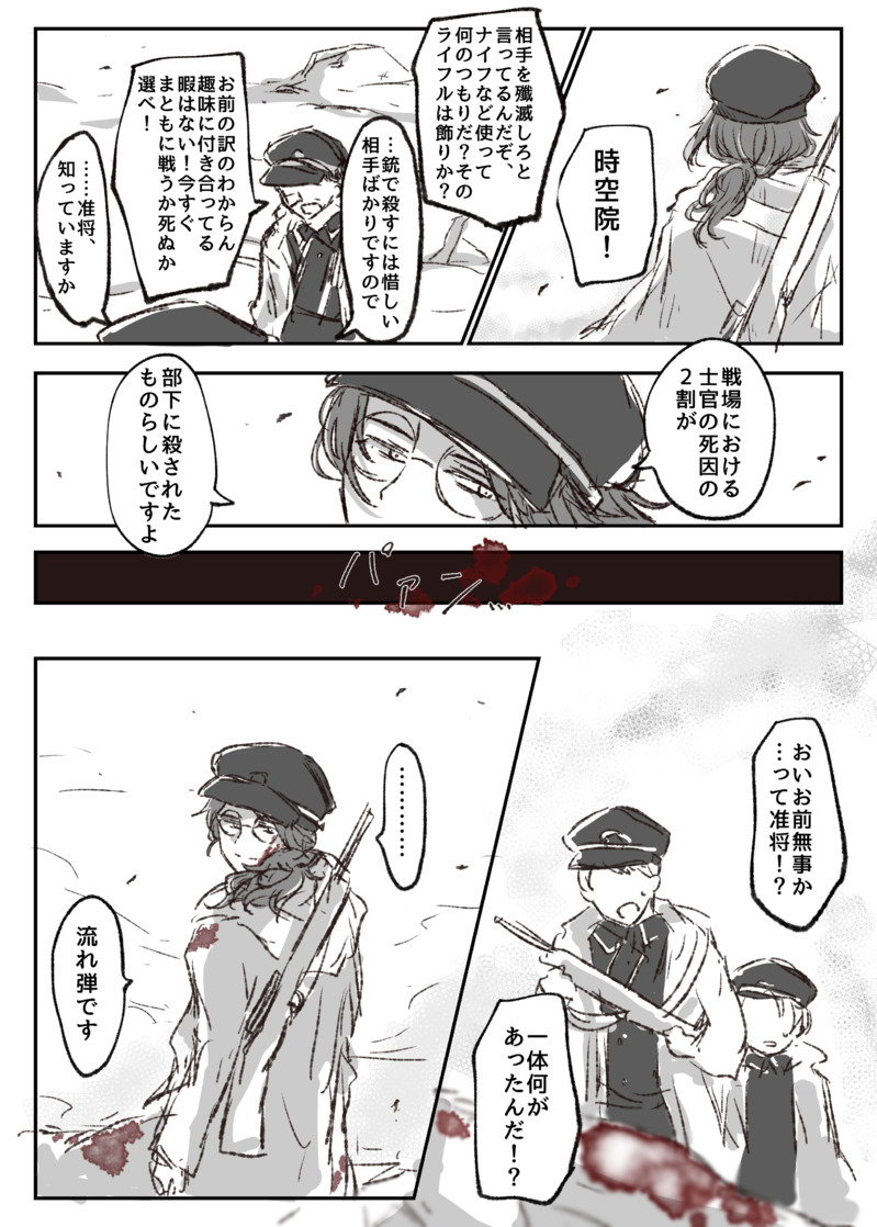 実際は横暴な准将をグラン大佐(いいやつ)が撃ち殺したシーンなんだけどどうしてもジクに戦場における〜のセリフ言って上官殺ししてほしくて描いちゃった……