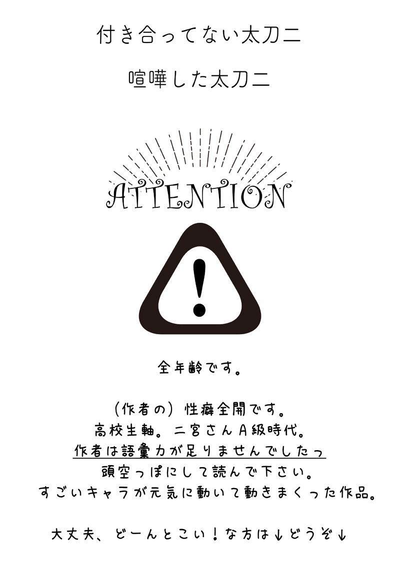 T_S_ERURI☆quiet followDONE01.エワ即売会(10)展示作品太刀二。小説。全年齢。全22P(+前置き)喧嘩したお話。10Pくらいでまとめるつもりが勝手に動いて2倍に膨れ上がった作品です。自分の書きたいとこは書けたので大満足です。 ##太刀二 ###たちにの show all(+22 images) Tap to full screen (size:2480x3508).Repost is prohibited Let's send reactions! freqpopularsnackothersPayment processing Replies from the creator Follow creator you care about!☆quiet follow T_S_ERURIDONE②2025たちにのまんなかバースデー。イラスト3P。全年齢。夏と海をイメージして対の太刀二を描きたかったのですが、私の画力がダメダメで太刀川さんがかけず、二宮さんのみアップすることにしました😭1枚目完成絵(太刀川さんから見た二宮さんとも言う)2枚目が影なし&加工前(現実の二宮さんとも)。3枚目がアップです☺️💕汗をかいた二宮さんを描けて大満足ですっっっ💞💞 3 T_S_ERURIDONE①2025たちにのまんなかバースデー。小説10P。全年齢。企画と全然関係ないです!!太刀二の被害者シリーズ第3弾ともいう。喧嘩?した太刀二に巻き込まれる諏訪さんのお話です!!!ようやく書けたので嬉しさ倍増です〜\(^o^)/ニコニコしながら書き上げました♡ 10 T_S_ERURIDONE2025年🎉🎁太刀→→((二♀。謎軸。全年齢。全16P。始終ハラハラな太刀川✗天然の最上級な二宮♀女体化です!!書きたかった!!!!満足!!!久々に片想い太刀二です〜〜?太刀川さんお誕生日おめでとうございます!!!!!(遅くなりました💦色んなイチャコラを書きたい!!! 16 T_S_ERURIDONE太刀二。R-18。注意書き+本文29P+挿絵2P敵の攻撃を受けたにのみゃさんが、情緒不安定になるお話。中身はからっぽのアホエロです(キリっかっこいい2人はおりません!!めちゃくちゃ書きたかったお話でもあるので、ようやく書けて大満足です。(挿絵はもっと描きたかった…たいりょく…)パス:18歳以上ですか?+二宮の誕生日(合計7桁) 32 T_S_ERURIDONE02.エワ即売会(11)展示作品太刀二。小説。R-18。全11P(+注意書き)ちょっとおかしな太刀川さんに翻弄される二宮さんが描きたかったのです。注意書き必読して下さい。大変満足です。パス:18歳以上ですか? yes+二宮の誕生日(合計7桁) 12 T_S_ERURIDONE01.エワ即売会(11)展示作品太刀二。1P漫画。全年齢。東二verも描きました。ふと、それぞれの二宮さんが見たくて描いただけです。棲み分けしてないので、一枚、間を噛ませてあります。そこでブラウザバックしてください。画力はログアウトしました。 3