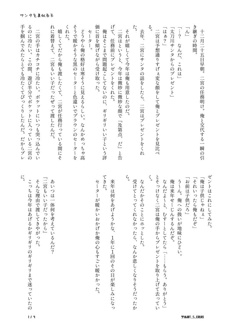 T_S_ERURI☆quiet followDONEクリスマス太刀二。全年齢4P。謎軸。前作→https://poipiku.com/485333/8078001.htmlサンタを真似る太刀川×サンタの代わりをする二宮地味に続いている…。またもやクリスマス過ぎているけど、月は変わってないのでセーフです!今年もありがとうございました〜❣ ##太刀二 ##たちにの show all(+3 images) Tap to full screen (size:1240x1753).Repost is prohibited Let's send reactions! freqpopularsnackothersPayment processing Replies from the creator Follow creator you care about!☆quiet follow T_S_ERURIDONE②2025たちにのまんなかバースデー。イラスト3P。全年齢。夏と海をイメージして対の太刀二を描きたかったのですが、私の画力がダメダメで太刀川さんがかけず、二宮さんのみアップすることにしました😭1枚目完成絵(太刀川さんから見た二宮さんとも言う)2枚目が影なし&加工前(現実の二宮さんとも)。3枚目がアップです☺️💕汗をかいた二宮さんを描けて大満足ですっっっ💞💞 3 T_S_ERURIDONE①2025たちにのまんなかバースデー。小説10P。全年齢。企画と全然関係ないです!!太刀二の被害者シリーズ第3弾ともいう。喧嘩?した太刀二に巻き込まれる諏訪さんのお話です!!!ようやく書けたので嬉しさ倍増です〜\(^o^)/ニコニコしながら書き上げました♡ 10 T_S_ERURIDONE2025年🎉🎁太刀→→((二♀。謎軸。全年齢。全16P。始終ハラハラな太刀川✗天然の最上級な二宮♀女体化です!!書きたかった!!!!満足!!!久々に片想い太刀二です〜〜?太刀川さんお誕生日おめでとうございます!!!!!(遅くなりました💦色んなイチャコラを書きたい!!! 16 T_S_ERURIDONE太刀二。R-18。注意書き+本文29P+挿絵2P敵の攻撃を受けたにのみゃさんが、情緒不安定になるお話。中身はからっぽのアホエロです(キリっかっこいい2人はおりません!!めちゃくちゃ書きたかったお話でもあるので、ようやく書けて大満足です。(挿絵はもっと描きたかった…たいりょく…)パス:18歳以上ですか?+二宮の誕生日(合計7桁) 32 T_S_ERURIDONE02.エワ即売会(11)展示作品太刀二。小説。R-18。全11P(+注意書き)ちょっとおかしな太刀川さんに翻弄される二宮さんが描きたかったのです。注意書き必読して下さい。大変満足です。パス:18歳以上ですか? yes+二宮の誕生日(合計7桁) 12 T_S_ERURIDONE01.エワ即売会(11)展示作品太刀二。1P漫画。全年齢。東二verも描きました。ふと、それぞれの二宮さんが見たくて描いただけです。棲み分けしてないので、一枚、間を噛ませてあります。そこでブラウザバックしてください。画力はログアウトしました。 3 recommended works ろくsanPAST #進撃の巨人 #エレン #エレン・イェーガー あやか/すずかPROGRESSペト誕のためにしたため中! 塩おむすびMOURNING #進撃の巨人 #アルミン 2 viviDONEエロース&プシューケー 3 零-Rei-PROGRESS友人への年賀状じゃwrwrdメンバー全員初めて描くね ひこぴこTRAINING本番前にもう1回塗りやっとくか間に合わなくなるからやめとくか…とりあえず簡単に塗れそうなの描いとく。眠い(´ - ω - `) 🐟️( ’-’ 🌭)DOODLE今年もよろしくお願いします kotonemuHappy New Year年賀状代わりの過去絵ビニーとリオくん 星城くぅDONE明けましておめでとうございます!本年も宜しくお願いします<(_ _)>申し訳ないことに今年の年賀状は時間の関係上テンプレに辻主ちゃんですが💦今年もいっぱい辻主描くぞー!