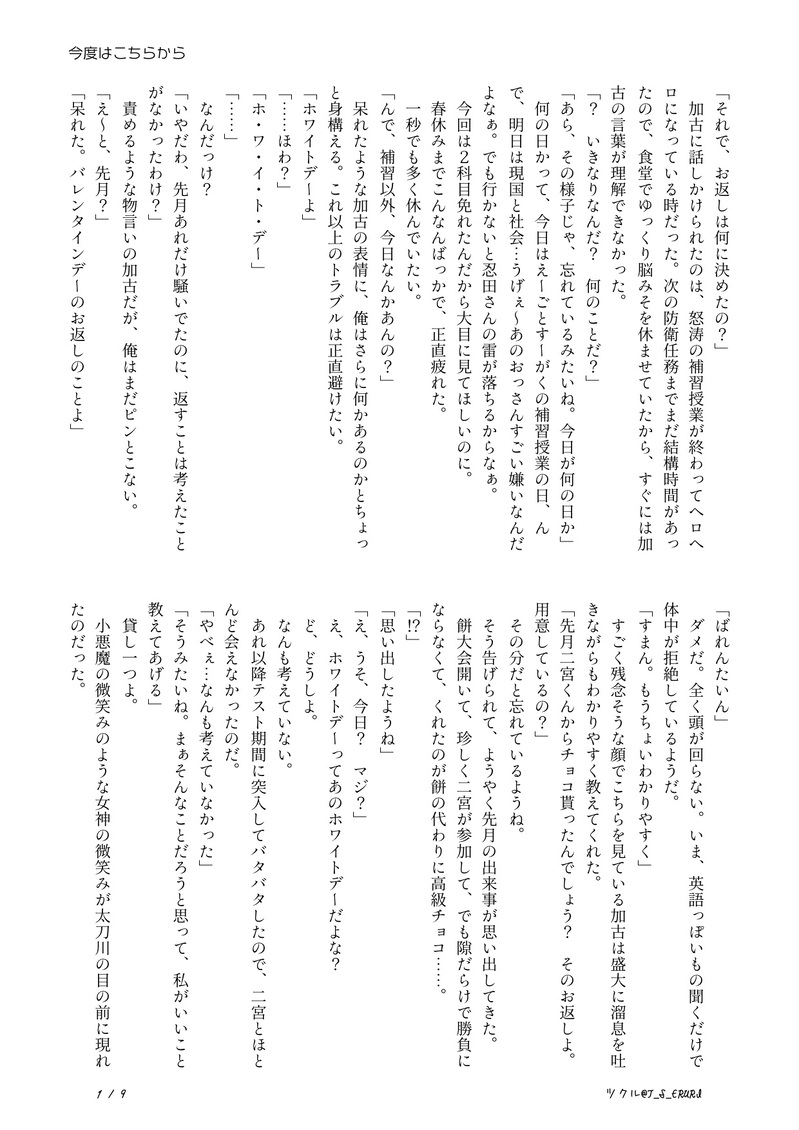 T_S_ERURI☆quiet followDONE太刀←二。ホワイトデー編。全年齢。全9P+挿絵前作→https://poipiku.com/485333/8333740.html行動に移す太刀川×奥手な二宮二宮さんの愛の起源とは…? と考えた結果こうなりました。(意味不二宮さんA級時代の軸です。もう色々書(描)ききって満足です。 ##たちにの ##太刀二 show all(+9 images) Tap to full screen (size:1240x1753).Repost is prohibited Let's send reactions! freqpopularsnackothersPayment processing Replies from the creator Follow creator you care about!☆quiet follow T_S_ERURIDONE②2025たちにのまんなかバースデー。イラスト3P。全年齢。夏と海をイメージして対の太刀二を描きたかったのですが、私の画力がダメダメで太刀川さんがかけず、二宮さんのみアップすることにしました😭1枚目完成絵(太刀川さんから見た二宮さんとも言う)2枚目が影なし&加工前(現実の二宮さんとも)。3枚目がアップです☺️💕汗をかいた二宮さんを描けて大満足ですっっっ💞💞 3 T_S_ERURIDONE①2025たちにのまんなかバースデー。小説10P。全年齢。企画と全然関係ないです!!太刀二の被害者シリーズ第3弾ともいう。喧嘩?した太刀二に巻き込まれる諏訪さんのお話です!!!ようやく書けたので嬉しさ倍増です〜\(^o^)/ニコニコしながら書き上げました♡ 10 T_S_ERURIDONE2025年🎉🎁太刀→→((二♀。謎軸。全年齢。全16P。始終ハラハラな太刀川✗天然の最上級な二宮♀女体化です!!書きたかった!!!!満足!!!久々に片想い太刀二です〜〜?太刀川さんお誕生日おめでとうございます!!!!!(遅くなりました💦色んなイチャコラを書きたい!!! 16 T_S_ERURIDONE太刀二。R-18。注意書き+本文29P+挿絵2P敵の攻撃を受けたにのみゃさんが、情緒不安定になるお話。中身はからっぽのアホエロです(キリっかっこいい2人はおりません!!めちゃくちゃ書きたかったお話でもあるので、ようやく書けて大満足です。(挿絵はもっと描きたかった…たいりょく…)パス:18歳以上ですか?+二宮の誕生日(合計7桁) 32 T_S_ERURIDONE02.エワ即売会(11)展示作品太刀二。小説。R-18。全11P(+注意書き)ちょっとおかしな太刀川さんに翻弄される二宮さんが描きたかったのです。注意書き必読して下さい。大変満足です。パス:18歳以上ですか? yes+二宮の誕生日(合計7桁) 12 T_S_ERURIDONE01.エワ即売会(11)展示作品太刀二。1P漫画。全年齢。東二verも描きました。ふと、それぞれの二宮さんが見たくて描いただけです。棲み分けしてないので、一枚、間を噛ませてあります。そこでブラウザバックしてください。画力はログアウトしました。 3