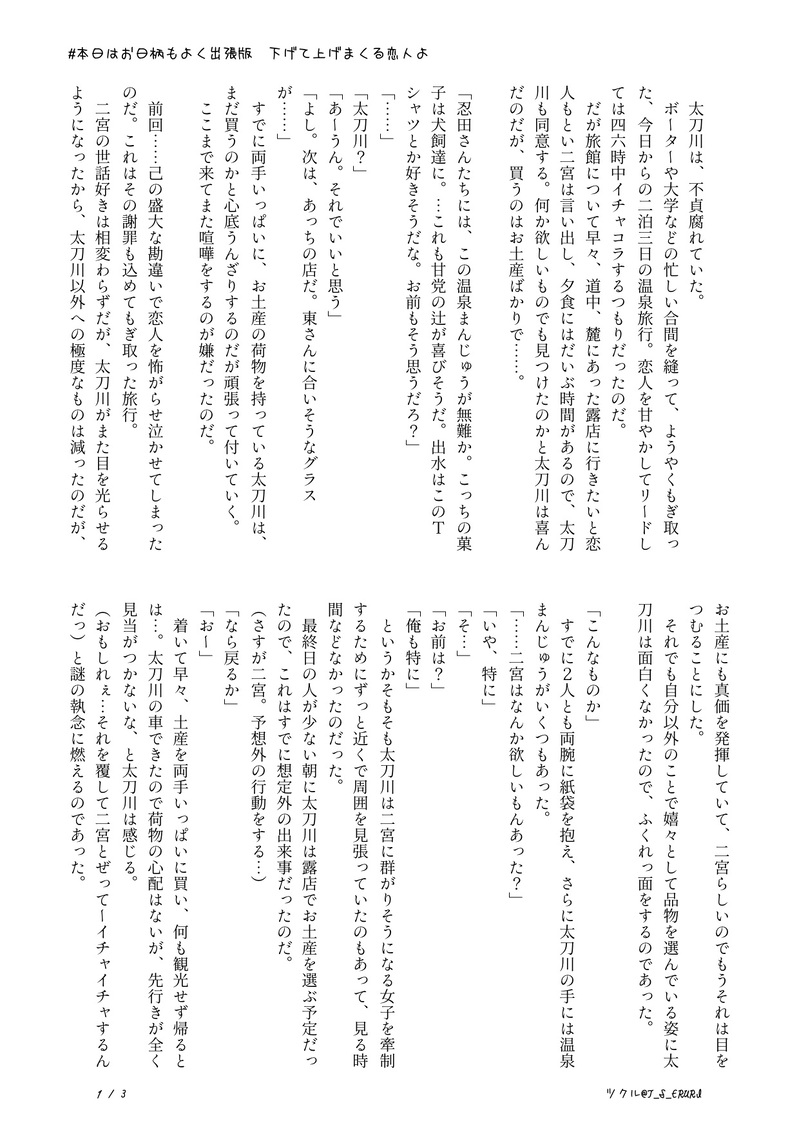 T_S_ERURI☆quiet followDOODLE06.エワ即売会(9)展示作品太刀二。全年齢。小説。全3P(+挿絵)本日はお日柄もよく 出張版、『旅行』をテーマにワンドロ企画の作品です。途中で文章も挿絵も力尽きてしまいましたが、書きたいところは思う存分書いたと思います。 ##太刀二 ##たちにの show all(+3 images) Tap to full screen (size:1240x1753).Repost is prohibited Let's send reactions! freqpopularsnackothersPayment processing Replies from the creator Follow creator you care about!☆quiet follow T_S_ERURIDONE②2025たちにのまんなかバースデー。イラスト3P。全年齢。夏と海をイメージして対の太刀二を描きたかったのですが、私の画力がダメダメで太刀川さんがかけず、二宮さんのみアップすることにしました😭1枚目完成絵(太刀川さんから見た二宮さんとも言う)2枚目が影なし&加工前(現実の二宮さんとも)。3枚目がアップです☺️💕汗をかいた二宮さんを描けて大満足ですっっっ💞💞 3 T_S_ERURIDONE①2025たちにのまんなかバースデー。小説10P。全年齢。企画と全然関係ないです!!太刀二の被害者シリーズ第3弾ともいう。喧嘩?した太刀二に巻き込まれる諏訪さんのお話です!!!ようやく書けたので嬉しさ倍増です〜\(^o^)/ニコニコしながら書き上げました♡ 10 T_S_ERURIDONE2025年🎉🎁太刀→→((二♀。謎軸。全年齢。全16P。始終ハラハラな太刀川✗天然の最上級な二宮♀女体化です!!書きたかった!!!!満足!!!久々に片想い太刀二です〜〜?太刀川さんお誕生日おめでとうございます!!!!!(遅くなりました💦色んなイチャコラを書きたい!!! 16 T_S_ERURIDONE太刀二。R-18。注意書き+本文29P+挿絵2P敵の攻撃を受けたにのみゃさんが、情緒不安定になるお話。中身はからっぽのアホエロです(キリっかっこいい2人はおりません!!めちゃくちゃ書きたかったお話でもあるので、ようやく書けて大満足です。(挿絵はもっと描きたかった…たいりょく…)パス:18歳以上ですか?+二宮の誕生日(合計7桁) 32 T_S_ERURIDONE02.エワ即売会(11)展示作品太刀二。小説。R-18。全11P(+注意書き)ちょっとおかしな太刀川さんに翻弄される二宮さんが描きたかったのです。注意書き必読して下さい。大変満足です。パス:18歳以上ですか? yes+二宮の誕生日(合計7桁) 12 T_S_ERURIDONE01.エワ即売会(11)展示作品太刀二。1P漫画。全年齢。東二verも描きました。ふと、それぞれの二宮さんが見たくて描いただけです。棲み分けしてないので、一枚、間を噛ませてあります。そこでブラウザバックしてください。画力はログアウトしました。 3