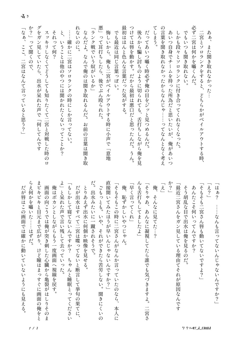 T_S_ERURI☆quiet followDONE太刀二。全年齢。全3P。知りたい太刀川×囁く二宮ベイルアウトする時、結構間がある時あるよな〜と思って考えついたもの。1Pで終わると思ったら結構伸びました。描けて満足です。 ##たちにの ##太刀二 show all(+2 images) Tap to full screen (size:1240x1753).Repost is prohibited Let's send reactions! freqpopularsnackothersPayment processing Replies from the creator Follow creator you care about!☆quiet follow T_S_ERURIDONE②2025たちにのまんなかバースデー。イラスト3P。全年齢。夏と海をイメージして対の太刀二を描きたかったのですが、私の画力がダメダメで太刀川さんがかけず、二宮さんのみアップすることにしました😭1枚目完成絵(太刀川さんから見た二宮さんとも言う)2枚目が影なし&加工前(現実の二宮さんとも)。3枚目がアップです☺️💕汗をかいた二宮さんを描けて大満足ですっっっ💞💞 3 T_S_ERURIDONE①2025たちにのまんなかバースデー。小説10P。全年齢。企画と全然関係ないです!!太刀二の被害者シリーズ第3弾ともいう。喧嘩?した太刀二に巻き込まれる諏訪さんのお話です!!!ようやく書けたので嬉しさ倍増です〜\(^o^)/ニコニコしながら書き上げました♡ 10 T_S_ERURIDONE2025年🎉🎁太刀→→((二♀。謎軸。全年齢。全16P。始終ハラハラな太刀川✗天然の最上級な二宮♀女体化です!!書きたかった!!!!満足!!!久々に片想い太刀二です〜〜?太刀川さんお誕生日おめでとうございます!!!!!(遅くなりました💦色んなイチャコラを書きたい!!! 16 T_S_ERURIDONE太刀二。R-18。注意書き+本文29P+挿絵2P敵の攻撃を受けたにのみゃさんが、情緒不安定になるお話。中身はからっぽのアホエロです(キリっかっこいい2人はおりません!!めちゃくちゃ書きたかったお話でもあるので、ようやく書けて大満足です。(挿絵はもっと描きたかった…たいりょく…)パス:18歳以上ですか?+二宮の誕生日(合計7桁) 32 T_S_ERURIDONE02.エワ即売会(11)展示作品太刀二。小説。R-18。全11P(+注意書き)ちょっとおかしな太刀川さんに翻弄される二宮さんが描きたかったのです。注意書き必読して下さい。大変満足です。パス:18歳以上ですか? yes+二宮の誕生日(合計7桁) 12 T_S_ERURIDONE01.エワ即売会(11)展示作品太刀二。1P漫画。全年齢。東二verも描きました。ふと、それぞれの二宮さんが見たくて描いただけです。棲み分けしてないので、一枚、間を噛ませてあります。そこでブラウザバックしてください。画力はログアウトしました。 3