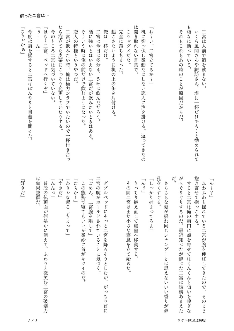 T_S_ERURI☆quiet followDONE太刀二。全年齢?。全3P。未来捏造謎軸。じゃんふぇすの件で、いくつか頭に降り注いだうちの一つをしたためました。破壊力抜群でしたね。。。悔いはない。ぼんやり誤魔化しているから全年齢だと信じてますがあれだったらそっとパス付きにします。 ##たちにの ##太刀二 show all(+2 images) Tap to full screen (size:1240x1753).Repost is prohibited Let's send reactions! freqpopularsnackothersPayment processing Replies from the creator Follow creator you care about!☆quiet follow T_S_ERURIDONE②2025たちにのまんなかバースデー。イラスト3P。全年齢。夏と海をイメージして対の太刀二を描きたかったのですが、私の画力がダメダメで太刀川さんがかけず、二宮さんのみアップすることにしました😭1枚目完成絵(太刀川さんから見た二宮さんとも言う)2枚目が影なし&加工前(現実の二宮さんとも)。3枚目がアップです☺️💕汗をかいた二宮さんを描けて大満足ですっっっ💞💞 3 T_S_ERURIDONE①2025たちにのまんなかバースデー。小説10P。全年齢。企画と全然関係ないです!!太刀二の被害者シリーズ第3弾ともいう。喧嘩?した太刀二に巻き込まれる諏訪さんのお話です!!!ようやく書けたので嬉しさ倍増です〜\(^o^)/ニコニコしながら書き上げました♡ 10 T_S_ERURIDONE2025年🎉🎁太刀→→((二♀。謎軸。全年齢。全16P。始終ハラハラな太刀川✗天然の最上級な二宮♀女体化です!!書きたかった!!!!満足!!!久々に片想い太刀二です〜〜?太刀川さんお誕生日おめでとうございます!!!!!(遅くなりました💦色んなイチャコラを書きたい!!! 16 T_S_ERURIDONE太刀二。R-18。注意書き+本文29P+挿絵2P敵の攻撃を受けたにのみゃさんが、情緒不安定になるお話。中身はからっぽのアホエロです(キリっかっこいい2人はおりません!!めちゃくちゃ書きたかったお話でもあるので、ようやく書けて大満足です。(挿絵はもっと描きたかった…たいりょく…)パス:18歳以上ですか?+二宮の誕生日(合計7桁) 32 T_S_ERURIDONE02.エワ即売会(11)展示作品太刀二。小説。R-18。全11P(+注意書き)ちょっとおかしな太刀川さんに翻弄される二宮さんが描きたかったのです。注意書き必読して下さい。大変満足です。パス:18歳以上ですか? yes+二宮の誕生日(合計7桁) 12 T_S_ERURIDONE01.エワ即売会(11)展示作品太刀二。1P漫画。全年齢。東二verも描きました。ふと、それぞれの二宮さんが見たくて描いただけです。棲み分けしてないので、一枚、間を噛ませてあります。そこでブラウザバックしてください。画力はログアウトしました。 3 recommended works あやか/すずかPROGRESS19EREN わしんこPROGRESS進撃の巨人、ミカサです!絶妙な表情が難しい泣コピックでこれも、塗っていきます!完成次第アップします(*ˊᵕˋ* ) わしんこPROGRESS進撃の巨人、アルミンです!海見れて良かったね。これも、コピックで塗って、、完成次第アップします! じんこ(じ)DOODLE進撃最新話 エレン NANDDONEあけましておめでとうございます。年女です!!!!!!!!!!!!!!!!!!!!!!!!!!!!!!!!!!!!!!!!!!!!!!!!!!!!!!!!(クソバカデカボイス) さんせーDONE⛩あけましておめでとうございます⛩年賀状絵 Ryuki(りゅうき)DONEあけましておめでとうございます!!2020年どうぞよろしくお願いいたします☺ Do not Repost・東龍Happy New Year 2 もじすけDONE一応兵長❤️