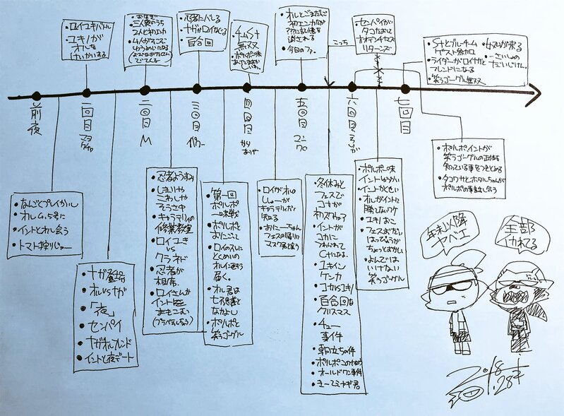 ponkotsuheart☆quiet followPAST時系列まとめ。このあとやってない、死ぬほど複雑化するから。 #海産物の馬鹿騒ぎ seafoodRamblings Tap to full screen (size:2048x1509).Repost is prohibited Let's send reactions! freqpopularsnackothersPayment processing Replies from the creator Follow creator you care about!☆quiet follow ponkotsuheartPASTサンリオフェス編ダイジェス卜版。修羅場待った無し、ファイッ!※屈託なく彼らが遊び倒せた貴重なフェスだったと思う。凄く大好きな回、長編に出来なかったのは今でも心残り。後のトリカラバトルである(違う 7 ponkotsuheartPAST彼女は子供と言うには行動力があり過ぎて、大人と言うには短慮過ぎていた。彼女はとても賢く遅しかったが、とても情が欠落していた。彼女は誰よりも強かったが、誰よりも孤独であった。運命と世界を歪める程だと、誰も気付いていなかった。※彼女の人となりは、割と初期から決まっていたのですよ。 4 ponkotsuheartPASTアサリ町ギンナン商店街編。アイツらがそっちの故郷行ってるなら俺らの地元行かない?ロイと共に彼らの故郷を訪ねる事にしたイントとユキノ。其処には兄の親友達との出会いや、ナンコツの里から引っ越してきたモモヤマー家との再会が待っていたのだった。※実はかなりのフラグ回だったりする。ジャンギュとミヤギの事、ロイの事、タロウザの初登場、GAの初登場など。 6 ponkotsuheartPAST未知先進フェス編。Twitter小説では既に登場していたシャロちゃん・ラク・ミストフィロ、この世界のヴィランズとも呼べるレヴォリャクザ、更に過去編に当時の猛者達とが一気に登場した回。 81 ponkotsuheartPASTスマイリーもちもちまとめ。ひたすら誰かしらがスマイリーを抱っこしたり頭に乗せたりしてる落書き。エアリス→ノーウェア組→ポルポル→海産物組の順。 82 ponkotsuheartPAST靴フェス、苦労人と忍者の暴走編。定期的にフェスで馬鹿騒ぎやらかしてる感じ。最終的には労っては貰えたオチだった気はする。思えば、オペラの最初のフリーダム此処か。 8 related works ponkotsuheartPAST上京半年B帯でドン詰まり状態のヘッポコだけど女子には見栄を張りたいボーイ×ナワバリ以外難しいで投げたら塗りマニアに進化した人見知りで特に男子が苦手で水中眼鏡が外せないガールの、恋未満物語。海産物の馬鹿騒ぎ、全ての始まり。 4 ponkotsuheartPASTヒーローの条件、ナガの場合。ナンコツ里や王者挑戦者フェスより前の話。 23 ponkotsuheartPAST花団子フェス、団子戦争編。結局漫画にしなかったのだけど、この段階でスマイリーの所のタコワサとポルポルがエンカしてるんですよね。 3 ponkotsuheartPAST夜。夜中になると絶対強いヤバいだろって人が増えると思う、どのゲームにしても。でも、案外そういうネタって見かけないよなぁ、とも。ナワバリに、ガチに、バトルに飢えた獣の時間。 10 ponkotsuheartPAST靴フェス、苦労人と忍者の暴走編。定期的にフェスで馬鹿騒ぎやらかしてる感じ。最終的には労っては貰えたオチだった気はする。思えば、オペラの最初のフリーダム此処か。 8 ponkotsuheartPASTオリイカ漫画、マヨケチャフェス編。イントはシオカラーズならホタル派でテンタクルズならイイダ派、特に機械オタクな所とウネウネの髪型が好き。オルはアオリ派でヒメ派、そしてヒーロー見習い4.5号として4号先輩が開拓したエリアで修行してる。 4 ponkotsuheartPASTナンコツの里、月と太陽の巡り編。正直「あ、ナガオル結婚したわ。」と思いながら描いてました、当時。 74 ponkotsuheartPAST未知先進フェス編。Twitter小説では既に登場していたシャロちゃん・ラク・ミストフィロ、この世界のヴィランズとも呼べるレヴォリャクザ、更に過去編に当時の猛者達とが一気に登場した回。 81 ponkotsuheartPAST誰が為のヒーロー也や編。コロイカ勢大活躍回、ゴーライ動かし易くて好き。 58