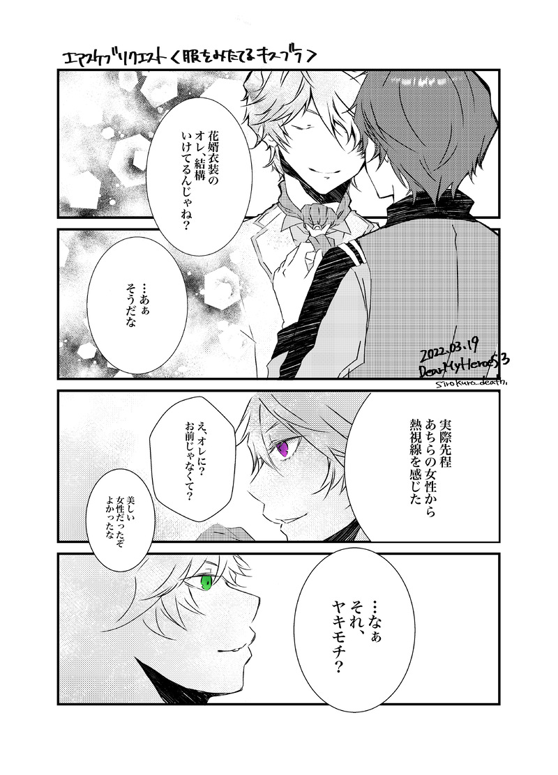 シロクロ☆quiet followDONEエアスケブ④DMH3で頂いた、服を見立てる🍺🍣ジュンブラに乗っかり(ありがちネタではありますが…)リクエストありがとうございました♪ show all(+1 images) Tap to full screen (size:3735x5193).Repost is prohibited Let's send reactions! freqpopularsnackothersPayment processing Replies from the creator Follow creator you care about!☆quiet follow シロクロDONEエアスケブドン!ウィルガスで承りました!未知の世界…!という訳でもし私がウィルガスの民だったらどんな感じのが好きかな?と考えたらこんな感じになりました。ウィルのガストへの感情ぐちゃぐちゃしてるけどでも好き、みたいな。ウィルのアドラー呼びが好きなのでずっとアドラー呼びしてほしい(ごめんガスト笑)リクエスト、ありがとうございました♡ シロクロDONE遅くなりましたエアスケブドン!🧪と🍩で承りました!まさかのパロディですみません笑ち…ちゃんや野…くんがわかる方はいつか握手しましょ♡🍩は初描きです。割と描けたような?野…くんの顔させたかったんですが難しくてあまり似なかった…いや似ない方がいいのか?リクエスト、ありがとうございました!次回も珍しい組み合わせをお送りします(予告) シロクロDOODLE真夜中のらくがき。こーゆー感じの、話を、描きたい シロクロDONEエアスケブ⑤「今コイツと飲んでるのオレだから、またにしてくんない?」 シロクロDONE詫びスケブ①「この件は、内密に」 2 シロクロDONELet's meet again some dayいつかまた会いましょうと言う気持ちを込めたオマケネップリ。