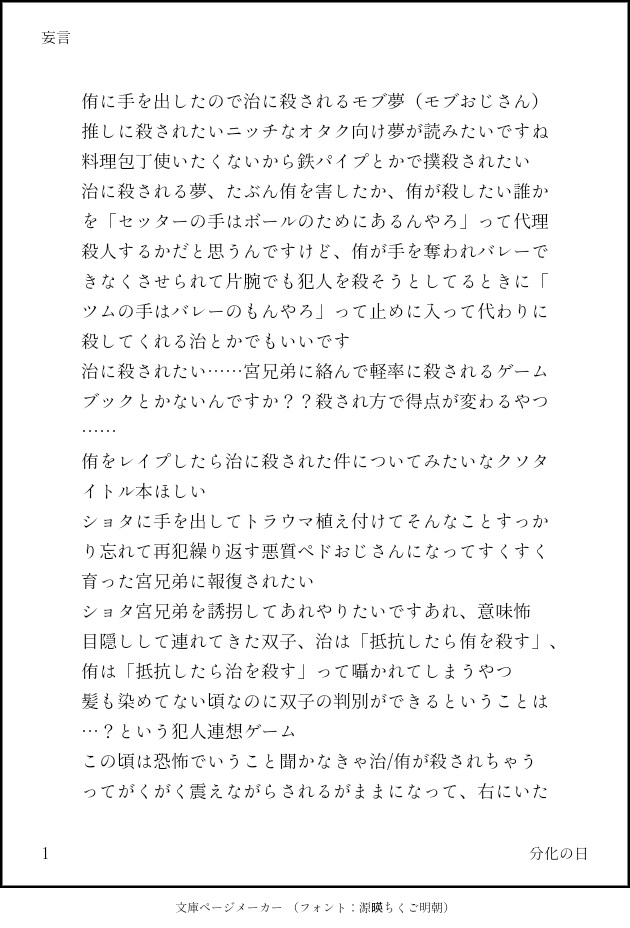 sa_saki888☆quiet followMOURNING※ワンクッション侑のモブレ匂わせあり show all(+1 images) Tap to full screen (size:630x928).Repost is prohibited Let's send reactions! freqpopularsnackothersPayment processing Replies from the creator Follow creator you care about!☆quiet follow sa_saki888MEMOこれ(https://www.pixiv.net/novel/show.php?id=14156285)のプロット 5 sa_saki888MEMO情報量の多いフードファイトの光景※生活感が溢れている sa_saki888MOURNING※ワンクッション侑のモブレ匂わせあり 2 sa_saki888MOURNING※ワンクッション欠損仄めかし 2 sa_saki888MOURNING※ワンクッションモブレ、非倫理 3 sa_saki888MOURNING※ワンクッションケーキバース治侑関連 3 recommended works No0a11111commission phobosXdeimos 人棍哦 熱々のらざにあDOODLE🐑🔮 同棲設定。夜にアイス食べていちゃいちゃするだけの話。 2116 HeyLorrainDOODLEDollHouse MothDOODLE髪がいいな~ 轮轮轮轮轮轮DOODLE 武器忍DOODLE思いつき4コマ日本語は2枚目に 2 ASAKURADONE由太郎の無知シチュ裏夢小説書こうとして、ちょっとえっちな甘酸っぱい話にしかならなかった前半です。裏垢作成の景気づけに上げます。2025年4月25日完成版はこちらから↓(※ネームレスです)https://www.pixiv.net/novel/show.php?id=24615189 7015 6v_0w0_v9DOODLE想像でシンシャの自陣の女子会パジャマパーティーに呼ばれたらどんな寝巻きで来るか bono_shioDOODLE豪炎寺♀