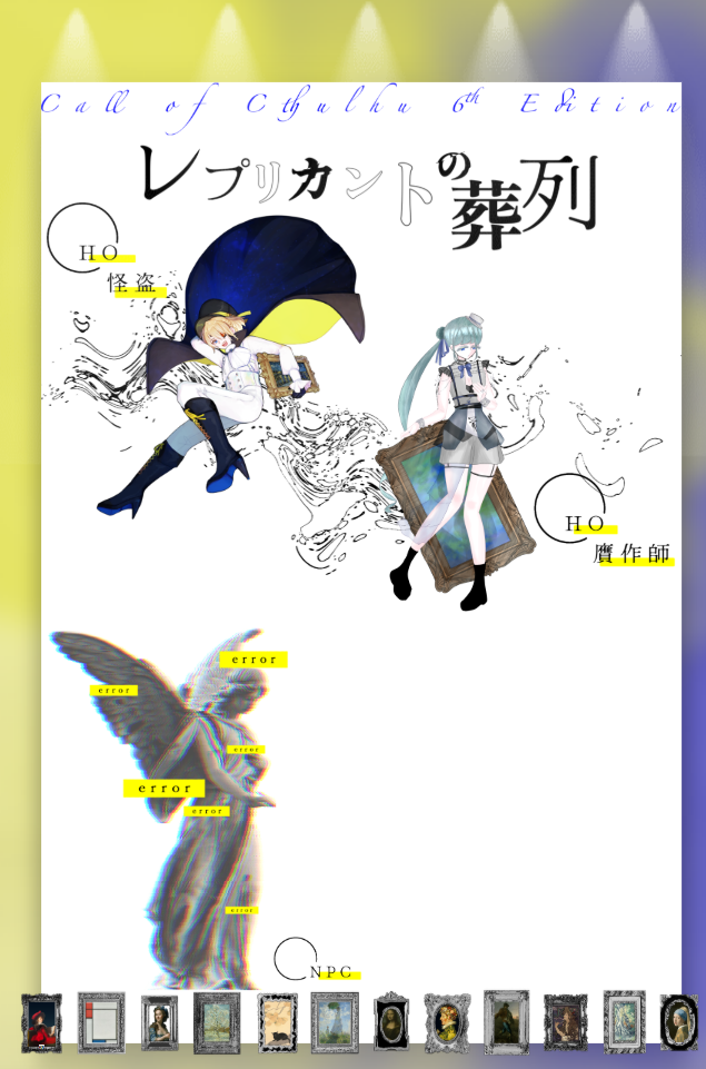 ことり☆quiet followMEMO2025/03/06・03/14・03/21・03/27✦レプリカントの葬列 作:○助 様✦KP :酸性物質✦ PC / PL✧ HO1:怪盗LUX / カリン✧ HO2:タレイア / 枸橘 茉莉END A ##卓報告 Tap to full screen (size:635x961).Repost is prohibited Let's send reactions! freqpopularsnackothersPayment processing Replies from the creator Follow creator you care about!☆quiet follow ことりSPOILER十二星座館殺人事件 現行未通過× ネタバレ有自陣絵まとめ+α🔑:最終日の半角数字4桁 16 ことりSPOILER十二星座館殺人事件 現行未通過× ネタバレ有自HO蟹座落書きまとめ ⚠️先天性TS有 7 ことりSPOILER十二星座館殺人事件 現行未通過× ネタバレ有自HO蟹座イメソンパロ絵(一部トレス有) ことりMEMO2025/08/04 ~ 2025/09/11✦ 十二星座館殺人事件 作:だるま倉庫 様✦KP :大賀✧SKP:えすま✦ PLしらこ/枸橘 茉莉/つヴぁい/カリン/ムゴ/きたみまのうえ/アク魔/ねき/しいな/らちゃ/ちゆEND 3 ことりDONE十二星座館殺人事件 HO蟹座立ち絵&表情差分 7 ことりMEMO2025/04/29~04/30✦ Princess Hugging Race!!! 作:キナシ 様✦ KPC / KP:百千鳥 天晴 / カリン✧ PC / PL:千風 洵平 / まなっくまEND 1