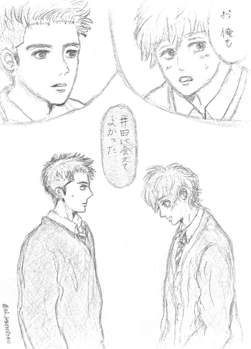 ai_ks03080410☆quiet followTRAINING31幕のつづき。 #いだあお father-in-law #イダアオ #消えた初恋 missingFirstLove Tap to full screen (size:1234x1716).Repost is prohibited Let's send reactions! freqpopularsnackothersPayment processing Replies from the creator Follow creator you care about!☆quiet follow ai_ks03080410DONEエアブー #キュンギュッ参加作品を投稿します。少しでもお楽しみいただければ嬉しいです。愛/昼休みの屋上匂い風薫る新緑の頃、ボクは生まれた。ママのおっぱいを吸い、兄弟姉妹とじゃれあった記憶は、今も頭の片隅に残っている。けれどもそれは、ほんの数日のはかない出来事だ。程なくしてボクは捨てられた。 前後して生まれた子らは、主の親戚や友達の手に渡った。何故かボクだけが引き取られることなく、気付いたらひとりぼっちでダンボール箱の中にいた。 クゥーンと鼻を鳴らしても、恋しいママはもうボクを舐めてはくれない。これからどうやって生きていけばいいんだろう。段々と心細くなる。堪え切れずにクゥーンクゥーンと鳴き続けていたら、ボクのカラダが陽だまりのような温かい匂いに包まれた。 「お前、家にくるか?」 これが浩介くんとの出会いだ。 3915 ai_ks03080410DONE目黒くん誕生日おめでとうございます。ドラマがきっかけで井田くんと目黒くんの大ファンになりました。ぜひぜひぜひぜひ続編をお願いします。2幕と18幕のパロです。 ai_ks03080410DONE「あいはしからのお年賀」 33幕パロです。「ふっ」と笑いたくなって描きました。橋下さんファンの方、お許しを。 2 ai_ks03080410DOODLE少し前のらくがき。たまに描きたくなります、こういうの。 ai_ks03080410DOODLE9巻おまけまんが「京都生活」の前夜を妄想して描きました。 9 ai_ks03080410DOODLE手書き。Twitter用。だいぶ前に描いた物アナログ描き、人差し指で色塗りしている人、他にもいるんでしょうか。ふとした時に涙があふれそうになる最終幕。 related works 720tanabataREHABILIイダの部屋でイダアオ② 720tanabataREHABILI🔞イダアオ(アオキがF) こつぶDONEメガネの~アオキ~部屋でリラックスして眠くなってる図。さりげなく同棲いだあお……みたいな…… 720tanabataREHABILI🔞イダアオ(イダがF) ヒミツDOODLE受験生は刺激がいっぱい ヒミツDOODLE2人の女が互いの腐敗を認識し合った瞬間であった。※なお、当人達距離感バグ気づいてません。 2 720tanabataREHABILIそういう雰囲気のイダアオ 720tanabataMAIKING🔞イダの家でイダアオ漫画⑥ 4 720tanabataREHABILIイダアオに深夜にカップラーメン食べてほしい(願望)