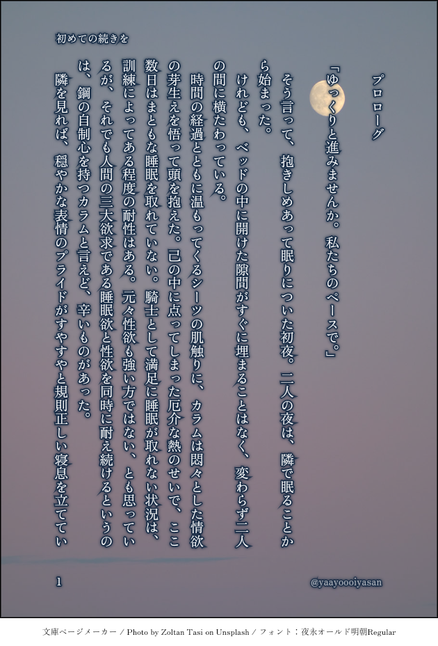 yue☆quiet followDONE「初めての続きを」カラプラ婚姻後のお話。初夜に失敗した二人のその後の夜がどうなるのか…いくつかの選択肢に沿ってストーリーが分岐します。1月10日頒布予定の新刊(成人向)の冒頭部分、サンプルと思っていただければ…。カラム隊長の苦悩しか書いてないので、ここまでは全年齢です。……この続きは不敬しか出てきません #カラプラ colorPlastic #ラス為 forLassoing #フリ博 show all(+9 images) Tap to full screen (size:630x928).Repost is prohibited yueMOURNINGラス為Web更新を溜めに溜めていたんですけど、ようやく読み始めました。自分なりに読まずに(読めずに)溜めていた理由があって、でも最新話の方で推しの活躍の気配を感じたからには追いつきたい気持ちも芽生え、大袈裟だけれど葛藤を超えてなろうのブックマークを多分一年以上ぶりで開きました。が、まぁ案の定どうにもならないモヤモヤがあって。ただ吐き出したいだけ。地獄の釜の蓋を開きたい人はツイのDMからどうぞ 5226 yueDONEカラプラ真ん中バースデー企画のワンドロワンライ思いっきり遅刻投稿ですが(苦笑) 正味一時間半!時間オーバーでした……カラプラ婚約者軸でふんわり夜の気配が漂ってますのでご注意を🙏匂わせ程度ですが念の為ワンクッションです 3 yueDONE婚姻後カラプラ、ついったで上げてた話の続き。5/7追記分でおしまいです。不敬成分は風味付け程度……というか、大人のおともだちならわかるよね( ◜ᴗ◝)なかんじです。 7 yueDONE婚姻後カラプラ前提ある朝のプラ様と専属侍女たちの会話。一年ほど放置してたネタツイがようやく形になり申した…。一応夜の話題なのでリス限にさせてください。直接的な表現はないです!※リスイン希望の方はTwitterの方からお知らせください 5 yueINFOフリ博Ⅲで展示、受注生産した不敬本「暁に臨む」のおまけSS。本編読了した方のみご覧くださいませ〜。パスワードは、最終ページの数字についているマークを漢字2文字で。おまけは、①ステイルver.②ティアラver. のふたつです! 2 yueDONE「初めての続きを(加筆修正前)」修正したものは別にあげてあります。元はどんなのだったのか気になる人だけ見てください。不敬垢で思いつくままに上げてたツイのまとめ。ゲームブック風に選択肢選んで進んで行く予定。※不敬な話しかないので色々注意⚠ 3 related works yueDONE婚姻後カラプお仕事中に夜のあれこれを思い出してどうしようもなくなったプラ様が、たいちょの所に凸する話。⚠年齢制限⚠リスイン希望の方はお気軽にどうぞ〜 12 すったまごDOODLE【カラぴよ漫画】・原稿用紙を初めて使ってみたので試しの四コマ漫画(内容はない) まほろDONEカラプラ婚姻済み。悪夢にうなされたプライドさまに、カラム隊長が「もう大丈夫だ」の言葉とともにおでこにおまじないのキスをする相互さんの素敵絵にインスパイアされて、シチュエーション違いでできたお話。 2 nizaki_DOODLEカラプラのらくがきたち(キスしてる絵があるのでワンクッション) 5 すったまごDOODLE【カラプラさんつめつめ】支部にあげたのと大体同じ一部セドティアちゃん要素あり 9 すったまごDOODLE【いちゃいちゃカラプラさん】フォロワさんへの誕生日プレゼント 2 yueDONEカラぷで婚姻後。カラもプラ様を呼び捨てで呼べるくらいにはなったけどまだお互い敬語はそのままな謎時空。カラムに色々してあげたいプラ様です。⚠年齢制限⚠リスイン希望の方はお気軽にどうぞ〜 8 まほろDONEカラプラ婚姻済み。いろいろ妄想と捏造してます(第一子・前世の母)。前世を思い出して第一子(女の子)の初節句を祝うプラ様のお話。カラムとレオンが仲良くなってればいいな、婚姻後も、公式の場以外はアランには「カラム」呼びしててほしいな、いろいろ希望を込めて。 10 すったまごDOODLE【医療パロでカラプラさん】・皆も健診受けようね!という結論に至るまで、同業種ふぉろわさんと如何わしい会話をしまくったネタ(ただバリウムとカメラの話をしただけ)・カラ先生が相変わらずムッツリ 4 recommended works toki_bluelaceDOODLE⑧城下デートカラプラらくがき漫画最終話はほんわり😇おまけ漫画とか描けたらpixivアップしようと思います〜 4 toki_bluelaceDOODLE幼プラ新兵カラバースデーらくがき漫画😊プラ→→→→←カラ!先にツイッターに上げた大人プラカラも一緒に〜 3 toki_bluelaceDOODLE前に描いた幼プラカラとその後をらくがき 2 toki_bluelacePROGRESSカラム隊長っっ すったまごDOODLEカラ+ネイでバニーの日2部仕様なので一応ワンクッション 2 すったまごDOODLEお題ガチャでカラプラさん(2022.9.5その後を追加)※婚約者確定後の設定※二人にとっては大事件 8 すったまごDOODLE【いろいろまとめ】①読書の秋隊長→②隊長だって夜は眠い③誕生日祝いとは思えない副団長(だんちょ親子をお説教部屋に連れていくの巻)④カラプラさんダンス⑤恋人自慢ジャンヌちゃん(カラプラさん)⑥甘やかしたいプラ、擽ったいカラ 7 すったまごDOODLE【からぷ結婚式妄想】以前ポイした、騎士団内での結婚お披露目