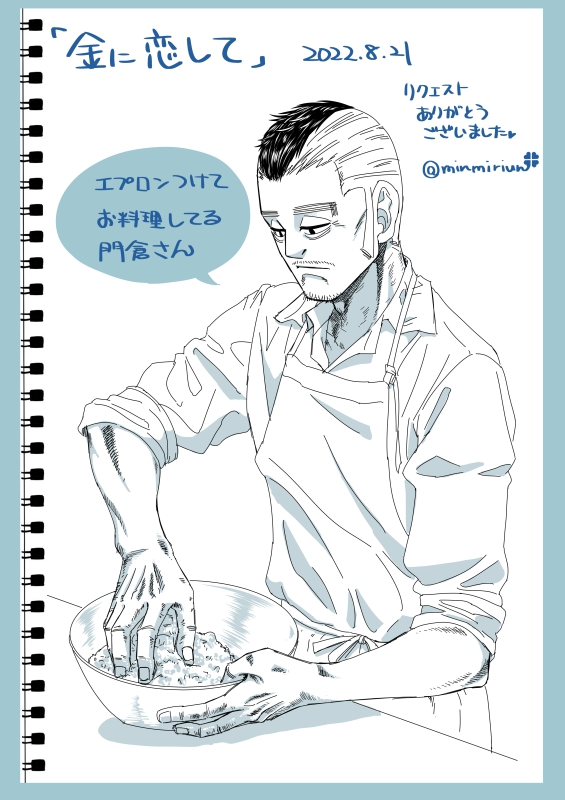 「エプロンつけてお料理してる門倉さん」(多分、釣った魚でハンバーグあたり作ってる)
