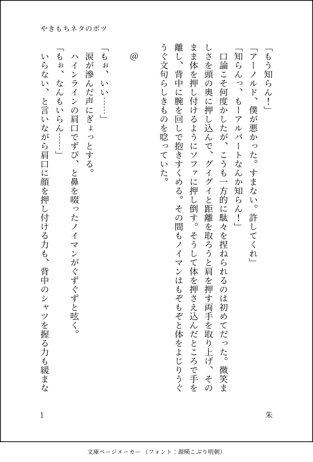 しま時々朱☆quiet followDOODLEやきもちネタで自分で解釈違い起こしたやつ。ノさんが酔ってて駄々っ子化。前提が思いつかなくてどうしようもなくなった…。 show all(+4 images) Tap to full screen (size:630x928).Repost is prohibited Let's send reactions! freqpopularsnackothersPayment processing Replies from the creator Follow creator you care about!☆quiet follow しま時々朱MEMO思いついた分だけしり切れとんぼ 3 しま時々朱DOODLEぺろぺろ話の後日談。操舵大尉の自家発電(バッテリー切れ)の話。 7 しま時々朱DOODLE操縦桿(暗喩)をぺろぺろされるのがあんまり気が進まない操舵大尉の操縦桿を技術大尉がぺろぺろする話。突然始まり突然終わる。 11 しま時々朱MEMO雄っぱいには筋肉とか色々詰まってる。場面飛び飛びで、あいすまぬ。 10 しま時々朱DOODLE色気のない初めてのそうにゅうネタ最後のセリフを言わせたいがためにねりねり。 3 しま時々朱MEMO支部のカプシリーズでおフェら解禁話を書こうとしたメモ。突然始まり突然終わってます。 3 recommended works わたあめDOODLE土井半助、失踪。 mikuri00000000DONEあじくろまつり2開催おめでとうございます!お正月用ペーパークラフトですローソンかファミマでA4光沢紙で印刷するとこんなのができます!期限は2024/12/21~7日間です 2 amdkhtkPROGRESS 𝔾𝕚𝕟𝕪𝕒MAIKING[進捗]アクリルスタンド(線画)まだ生きてる。頑張ります。 HashibaPAST君の胸毛に恋してる♪DCEUクラブル。2018年の本の再録。ほぼギャグ。 15 As9asIPROGRESS 2857 たまごやきDOODLE不意打ちキス ヤイチTRAININGただの練習 だけど時間空きすぎて使ってるペンも変わってるしで投げ出した 2 ナサギナDONE