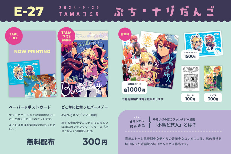 poco_nazo☆quiet followMENU2024年9月29日開催のTAMAコミ9のお品書きです。おしらせが前日になってしまいましたが、よろしくお願いします~!▼おしらせ記事https://puchinazo.stars.ne.jp/blog/2024/08/06/7708/ show all(+1 images) Tap to full screen (size:1500x1000).Repost is prohibited Let's send reactions! freqpopularsnackothersPayment processing Replies from the creator Follow creator you care about!☆quiet follow poco_nazoDOODLE北ティア初参加します!楽しみです~応援絵文字もありがとうございます! 2 poco_nazoINFOコミ御礼153とTAMAコミ11ではどうもありがとうございました!▼感想御礼記事https://puchinazo.stars.ne.jp/blog/2025/09/27/8436/ poco_nazoINFO2025年11月24日開催のCOMITIA154へ申し込みしました! poco_nazoINFO小鳥と旅人 総集編2の再版分に追加したあとがきです~。 poco_nazoDOODLEひんやり冷やしエトテイです poco_nazoDONEあっつあつの青年少女! recommended works kerumu102DONE #オリジナル #創作 LEO@唐草のくまDONE意地悪大好きアクマちゃん!#女の子#創作 もるとばDONE🦁「例のブツは見つかったか」😼「はい、車を用意しています。お乗りください」🦁「いや〜しかし楽しみだな。行列ができる店のいちごパフェ」😸「そうですね」 wawonTIRED natsuho0715DONE「適当なんてダメっ!!ちゃんと、緑依風ちゃんのこと考えて選んであげて!」84話 薄情者のイメージイラストでした 石田。DOODLE「なんだ。男の三つ編みがそんなに珍しいか?」この前ポイした、旅をしている男の子と一緒に旅をしている青年です。左目は子供の頃にかかった病気のせいで、今は見えておらず(光は察することができる)髪で隠している。とある小さな街で相談所をやっており、子供たちからは絶大な信頼を得ていた。ちなみに、髪の三つ編みはこの子供たちによるものだったりする(自分では髪を結べない) トイショップDOODLE【創作】アザゼルの山羊グリム🔹が可哀想な話 見縞みおTRAINING お茶っ葉っぱDOODLE創作NL 3