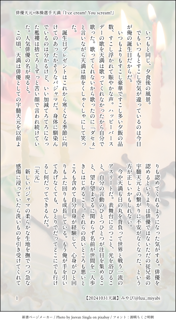 みやび☆quiet followDONE💎天元×🏅天満の天天・その18。20241031💎ハピバ🎂🎉従兄弟同士で💎は俳優、🏅は体操選手の現パロです。💎視点。⚠️同顔CPでがっつり絡んでます。「大丈夫!どんとこい!」という方のみ閲覧ください。 show all(+5 images) Tap to full screen (size:618x1132).Repost is prohibited Let's send reactions! freqpopularsnackothersPayment processing Replies from the creator Follow creator you care about!☆quiet follow みやびDONE【献上品💎🏅】くやまさん、お誕生日おめでとうございます🎉 💎🏅を愛でる会、ニッチの会盟友のくやまさん(@ngwkym)に捧げます🎁『🏅くんの誕生日』というお題を頂戴して書かせていただきました。くやまさんちのピアニスト💎さんと体操選手🏅くんです☺️ 6 みやびDONE【💎×🐱🏅】天元と猫天満のお話その4️⃣天満くん視点。天満くんのビジュアルは猫耳猫尻尾付きのヒト型です。そういう種族が混在する謎世界です。その3️⃣(💎視点)の視点変え+α。🏅くん着々と成長中。またちょっとだけ進展しました。 17 みやびDONE【💎×🐱🏅】天元と猫天満のお話その3️⃣天元さん視点。天満くんのビジュアルは猫耳猫尻尾付きのヒト型です。そういう種族が混在する謎世界です。その2️⃣の頃から少し大きくなりました。まだまだほのぼのハートフルな感じですがちょっとだけ進展しました。 6 みやびDONE【献上品💎🏅】昨年のくやまさんのお誕生日にお題『ひとりえっち』で書かせていただいた話が拙宅設定の俳優💎×🤸🏅だったので、ベースはほぼそのままくやまさん宅の🎹💎×🤸🏅の2人に変換してみました😊似て非なる!書いてて面白かったです!元はこちら⬇️(https://poipiku.com/4956556/9230744.html)PASS:18↑?(yes / no) 10 みやびDONE💎天元×🏅天満の天天・その18。20241031💎ハピバ🎂🎉従兄弟同士で💎は俳優、🏅は体操選手の現パロです。💎視点。⚠️同顔CPでがっつり絡んでます。「大丈夫!どんとこい!」という方のみ閲覧ください。 6 みやびDONE💎天元×🏅天満の天天・その17。従兄弟同士で💎は俳優、🏅は体操選手の現パロです。職業ゆえに💎が🏅以外と絡む表現がありますので、あらゆる面で「固定派」の方はご注意ください。🏅視点。⚠️同顔CPでがっつり絡んでます。「大丈夫!どんとこい!」という方のみ閲覧ください。 9