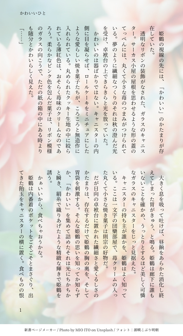 kumamimm☆quiet followREHABILIかわいいひと/にこひめ御前のお気に入りのかわいいお菓子をつまみぐいしようとするひめつるくんと、それを窘めるにっこーくんの話です。リハビリに書きました。にっこーくんはかわいいね! show all(+4 images) Tap to full screen (size:618x1132).Repost is prohibited Let's send reactions! freqpopularsnackothersPayment processing Replies from the creator Follow creator you care about!☆quiet follow kumamimmDONE星の砂になれなかったきみへ/笹貫と大慶直胤某コラボ展示の描き下ろし笹貫を見てたまらない気持ちになり、ふと「そこに大慶くんがいたらなんて言うかな?」と思ったので書いてみました。※個人の感想・都合のいい解釈を多分に含みます 4 kumamimmDONE青空の前の日/雲生と後家兼光、秋田藤四郎夜戦帰り、思うように戦えなくて悔しかった思いを引きずってしまう雲生くんと、ごっちんの持ってきたお夜食の話です。色々なことを私の都合のいいように妄想しています。 5 kumamimmDONE愛の名前/後家兼光と姫鶴一文字ごっちんと四季の話を書いてきましたが、こちらの冬の話が最後になります。本丸で約一年を共に過ごしたごっちんとひめつるくんの、これまでとこれからの話です。ごっちん実装一周年おめでとう!この号で、この姿で、顕現してくれてありがとね、という気持ちで書いてます。 6 kumamimmDONE夏の日、畑の打刀/後家兼光と桑名江と蜻蛉切早朝の畑で作物の収穫をしながら畑に立つ理由について話す二振りの話。桑名くんが畑に立つ理由を書き始めたら長くなってしまいましたが、出してきた個人誌でも書ききれなかった部分を言葉にできたので満足しています。蜻蛉切さんも来るよ!※来歴等歴史の関わる部分に関しては、私にとって最大限に都合のいい解釈で書かれています。 9 kumamimmDONE秘密をひとつ/くわまつくわまつドロライさん過去お題収穫祭「残り香」で書かせていただきました!久しぶりに参加できて楽しかった〜!4周年おめでとうございます&いつも本当にありがとうございます……! 2 kumamimmDONEただすこやかであれかしと/後家兼光とこどもの日半年以上遅れましたがごっちんとこどもの日の話を書きました!弊本丸では人間一年生の子はどんなに大きくてもこどもの日の主役の一振りにカウントされます。※歴史上の人物が関わる箇所については私にとって最大限都合の良い解釈をしております 6