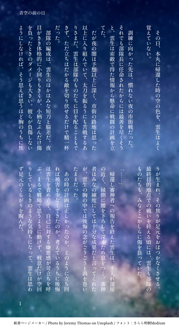 kumamimm☆quiet followDONE青空の前の日/雲生と後家兼光、秋田藤四郎夜戦帰り、思うように戦えなくて悔しかった思いを引きずってしまう雲生くんと、ごっちんの持ってきたお夜食の話です。色々なことを私の都合のいいように妄想しています。 show all(+4 images) Tap to full screen (size:618x1132).Repost is prohibited Let's send reactions! freqpopularsnackothersPayment processing Replies from the creator Follow creator you care about!☆quiet follow kumamimmDONE星の砂になれなかったきみへ/笹貫と大慶直胤某コラボ展示の描き下ろし笹貫を見てたまらない気持ちになり、ふと「そこに大慶くんがいたらなんて言うかな?」と思ったので書いてみました。※個人の感想・都合のいい解釈を多分に含みます 4 kumamimmDONE青空の前の日/雲生と後家兼光、秋田藤四郎夜戦帰り、思うように戦えなくて悔しかった思いを引きずってしまう雲生くんと、ごっちんの持ってきたお夜食の話です。色々なことを私の都合のいいように妄想しています。 5 kumamimmDONE愛の名前/後家兼光と姫鶴一文字ごっちんと四季の話を書いてきましたが、こちらの冬の話が最後になります。本丸で約一年を共に過ごしたごっちんとひめつるくんの、これまでとこれからの話です。ごっちん実装一周年おめでとう!この号で、この姿で、顕現してくれてありがとね、という気持ちで書いてます。 6 kumamimmDONE夏の日、畑の打刀/後家兼光と桑名江と蜻蛉切早朝の畑で作物の収穫をしながら畑に立つ理由について話す二振りの話。桑名くんが畑に立つ理由を書き始めたら長くなってしまいましたが、出してきた個人誌でも書ききれなかった部分を言葉にできたので満足しています。蜻蛉切さんも来るよ!※来歴等歴史の関わる部分に関しては、私にとって最大限に都合のいい解釈で書かれています。 9 kumamimmDONE秘密をひとつ/くわまつくわまつドロライさん過去お題収穫祭「残り香」で書かせていただきました!久しぶりに参加できて楽しかった〜!4周年おめでとうございます&いつも本当にありがとうございます……! 2 kumamimmDONEただすこやかであれかしと/後家兼光とこどもの日半年以上遅れましたがごっちんとこどもの日の話を書きました!弊本丸では人間一年生の子はどんなに大きくてもこどもの日の主役の一振りにカウントされます。※歴史上の人物が関わる箇所については私にとって最大限都合の良い解釈をしております 6