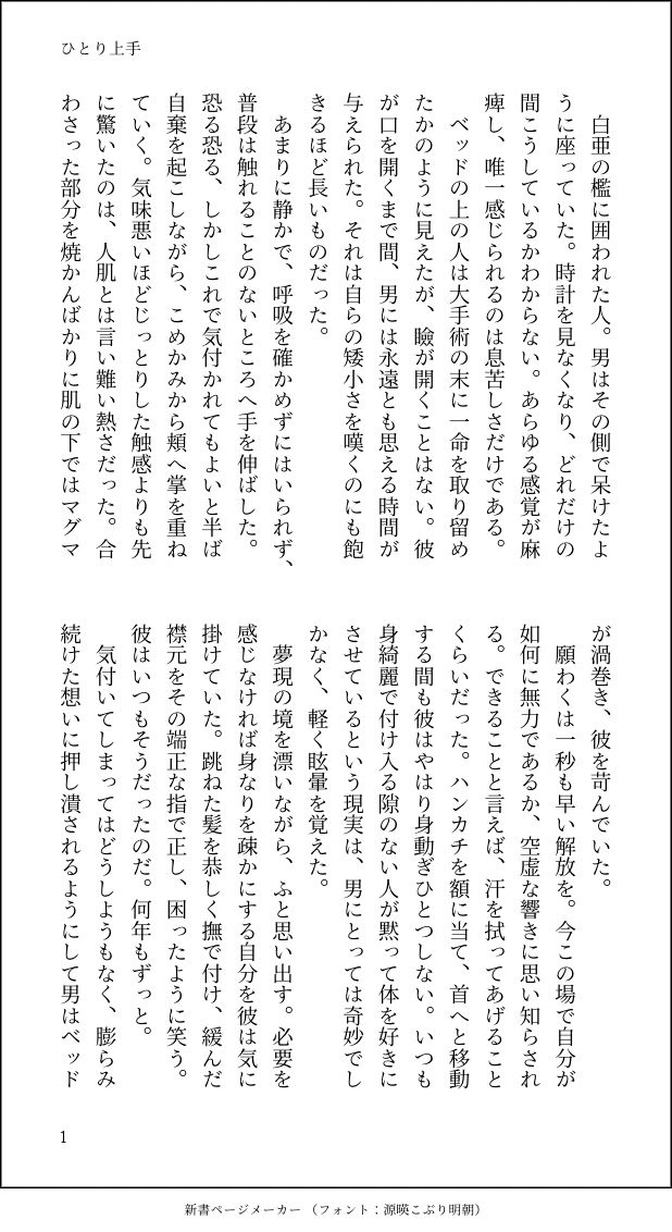 わ縞 wajima☆quiet followDONE主ニル両片想い置いていかれたくない男達 ##TNT #主ニル principalNil #Protagoneil #小説 novel show all(+3 images) Tap to full screen (size:618x1132).Repost is prohibited Let's send reactions! freqpopularsnackothersPayment processing Replies from the creator Follow creator you care about!☆quiet follow わ縞 wajimaDONEニールを風呂に入れる話 9 わ縞 wajimaDONE甘くて苦い半分こ主ニル利き小説に参加しました。お題は「2」二周年のお祝いに 9 わ縞 wajimaDONE主ニル二人での任務の後、ニールの様子がいつもと違い……。弁えようとする男と我儘になってほしい男性的描写あり 6 わ縞 wajimaDONE「毛」WEBアンソロ企画に捧げます🌾 4 わ縞 wajimaDONE主ニル生存ifニル→←主←ニル 4 わ縞 wajimaDONE主ニル生存if想いを確かめ合った夜 4 related works @1__gohPROGRESS12/10 進捗です間に合うといいな… @1__gohPROGRESS02/21進捗 R18ペン入れしていないので画面汚いです 02/22 恥ずかしいのでフォロワーさん限定にしました~ かのえですDOODLEわんわんおーーーー🐶 @1__gohPROGRESS(テネ)(BL表現注意)バレンタインなので甘そうな(?)進捗あげておきます 2 chorikoDONEテネット+T-34+ダンケルクのごった煮カオス漫画 12 yokusaruruDONE 2 かのえですDOODLEプロタゴさんにストールを可愛く結ばれちゃえばいいの🎀 firstPASTTwitterで流していたテネらくがきなどのまとめです 主ニルとあと中の方や出演作関連も含みます(ザバツとか) ぺぐちゃんさんとかウォンさんとかトビスパ氏とかダンカンさんとかかびるシャーロックお兄さんとかもちょっと最初に パスワードはPさんとニルくんの中の方イニシャルを小文字5文字でお願いします 39 yokusaruruDOODLE主ニル recommended works かほる(輝海)PAST2019.10.29今日のビデオリマスター版の上映会の中で、「EDで獠が十字架ネックレスをつけていた理由」について発言があったらしい。神様なんて信じてないやつがどうして…とは思ってたけど、そういうことなら納得。そして、去年、ワンライでそんな話を書いた覚えがあったのでサルベージ。 3 🏖🐬DOODLE【1】序盤から付き合ってるサルアデュちゃん 407 かほる(輝海)DONEシティーハンター冴羽獠×槇村香原作以上の関係背中合わせに座ってる二人を書いてみたくて、書いてみた(*´ω`*)話の中で二人は服を着てませんが、ほぼ会話だけなので全年齢とします。 2392 わ縞 wajimaDONE主ニル生存if想いを確かめ合った夜 4 マカロニサラダPROGRESS前回の月が消えた世界の続き落ちが見つからないので途中で止まってる😵💫https://poipiku.com/201517/7710362.html⚠️虐待表現 3381 グラニュー糖*DOODLE臨時執事 mizuyou_kanDONEマが千🖐️隊員を率いる話#4の続き🔞。柱マダ、扉マダの入り乱れですので何でもOKな方のみどうぞ。 pass:y R18以外の部分はXに掲載。 11 szrn541REHABILI剃毛する壮環 本番するかはこれから考えます 2852 FusaTomo_PROGRESS小説