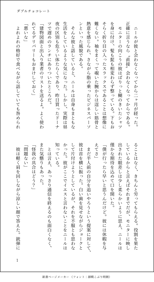 わ縞 wajima☆quiet followDONE甘くて苦い半分こ主ニル利き小説に参加しました。お題は「2」二周年のお祝いに ##TNT #主ニル principalNil #Protagoneil #小説 novel show all(+8 images) Tap to full screen (size:618x1132).Repost is prohibited Let's send reactions! freqpopularsnackothersPayment processing Replies from the creator Follow creator you care about!☆quiet follow わ縞 wajimaDONEニールを風呂に入れる話 9 わ縞 wajimaDONE甘くて苦い半分こ主ニル利き小説に参加しました。お題は「2」二周年のお祝いに 9 わ縞 wajimaDONE主ニル二人での任務の後、ニールの様子がいつもと違い……。弁えようとする男と我儘になってほしい男性的描写あり 6 わ縞 wajimaDONE「毛」WEBアンソロ企画に捧げます🌾 4 わ縞 wajimaDONE主ニル生存ifニル→←主←ニル 4 わ縞 wajimaDONE主ニル生存if想いを確かめ合った夜 4 related works KHAO_PodDOODLESuit up ぴよぴよチキンPROGRESSとりあえずひと段落 MissHardyLowSPOILEREclipse #2 3 bedmakuraDOODLE「あ……」 KHAO_PodDOODLEError 2 ぴよぴよチキンDOODLEシーツ着てるニール MissHardyLowSPOILEREclipse #1 bedmakuraDOODLE※※R⓲※※Neil is the Protagonist's ---. 2 @1__gohPROGRESS(テネ)(BL表現注意)バレンタインなので甘そうな(?)進捗あげておきます 2 recommended works 文月ちえり&中の人TMP-SAVEドラハー小説の構想メモ。Pixiv未公開。卒業後の未来設定。if設定。マグル界での生活を選んだ?ハーマイオニーと、魔法界で社会人?をしてるドラコ。こういう話も書きたい〜〜〜!!#ハリポタ #ドラハー #二次創作 #小説 #現代パラレルっぽい #構想メモ #プロローグ 7 twilight_topazMOURNING過去に書いたアジアン習作 暗愚王と毒見の復讐 7 siro1516TRAINING『小さな子どもとの旅行編(後編)』は、義勇さんも自分が思っていた以上に炭治郎くんを欲してるって事を書きました。そしてどんな義勇さんでも小さくなっても受け止めくれる優しい炭治郎くんを書いてます。少しずつ2人で成長してくれる小説をこれからも書きたいです。もしよろしければお読みください。 17 Wasru_pika025MOURNING題『初恋と—』病院で出会った女の子との話。全11ページ【追記】一部文章を修正しました。 11 かほる(輝海)DONEシティーハンター冴羽獠×槇村香原作以上の関係ワードパレット20.海王星貝がら/いつもの/面影 422 nap_p6DOODLE18歳以上ですか?(y/n) こもやまTRAINING 302 かほる(輝海)PASTシティーハンター冴羽獠×槇村香原作以上の関係ミックの日なので、ブログからミックが出演している過去作を掲載。ブラッシュアップ版が赤黒本に収録されていますが、今回はブログのまま(横書き)で転載。お題『こっぱずかしいこと言わせるな…!』初公開日2008.12.1お題提供元「嗚呼-argh」さま雄たけび系お題https://argh2.xxxxxxxx.jp/ 2232 kurekuretaquoraDONEイチャイチャ
