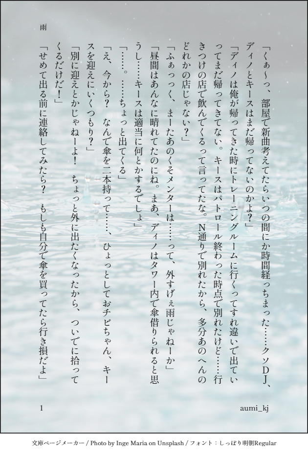 aumi_kj☆quiet followDOODLE雨の日/キスジュニ(キ←ジュ)/2022.June show all(+3 images) Tap to full screen (size:630x928).Repost is prohibited Let's send reactions! freqpopularsnackothersPayment processing Replies from the creator Follow creator you care about!☆quiet follow aumi_kjDONE【フェイディノ】好きな人が犬になった・フェイディノ+キース・Winter Fairytaleのディノのスペカネタです。・付き合ってない(両片思い)です。 6 aumi_kjDONE【フェイディノ】押忍エリ時空のシリーズ。(2023/02)この前:③https://poipiku.com/4966319/8342401.html1~4P:キースとフェイス うわさの二人同士の初迎合5~11P:フェイスとディノ 答え合わせ回 11 aumi_kjDONE【フェイディノ】押忍エリ時空のシリーズ。(2023/02)この前:②https://poipiku.com/4966319/7529326.html1~4P:フェイスとディノ 冬の訪れとすれ違い5~8P:キースとディノ 親友で同僚で腐れ縁次:④https://poipiku.com/4966319/8342429.html 8 aumi_kjDOODLE【キスジュニ/フェイディノ】キスジュニのキとフェイディノのフェがパンケーキが出来るまでとりとめのないおしゃべりをしているSS。※カプ複合なのでご注意ください!!!(2023/1) 4 aumi_kjDOODLE正月イベ時エリチャンのキースの料理番組ネタSS/西4人/カプ無し(2023/1) 3 aumi_kjDONE【ウィルシャム】観覧車デートの話。(2022/9に書いた話)※イクリプスとの戦いが終息した後でシャムスはエリオスで保護監察処分となっています。特に前回の話しとは繋がってはいません。※1箇所、ウィルの台詞の「俺」が「オレ」になってしまっています。 4 recommended works 根ッコDOODLE水父※ツッコミ不在 2 yyyDOODLEmisc. bottom (all x) harumasa stuff (zzz) 21 つん助DOODLE 2 チャイコINFOマロお返事です🤭ほんとにありがとうございます! 512 Ashunaro50DOODLE電車が暇すぎて描いてたセイバー 桝野ヨシタカMEMO鉛筆タッチのペンにハマってるので。朝の写経感覚で。ウチの片割れ。リハビリの初歩は模写ありきかなと思ってるので、最早写経。ローニンは凄いね、他の作品の3Dモデルだと関節の可動域超えて妙な動きするキャラクターもいるのに、それがほぼ無い。撮影モードでモーション動かしてても惚れ惚れする。楽しい。…本編今のキャラメイクでもかなり満足してますけど、髪型と髭バリエーション追加DLC欲しいです🥹 樂桜❀DOODLE最近の落書きコーナーですほとんど真緒くんです企画に参加させていただいたので*ˊᵕˋ* 9 ゆみばかINFOようこそ!迷冥市役所都市伝説課へ!エンド2後 自陣イラスト 2 POI11043766DOODLE 11