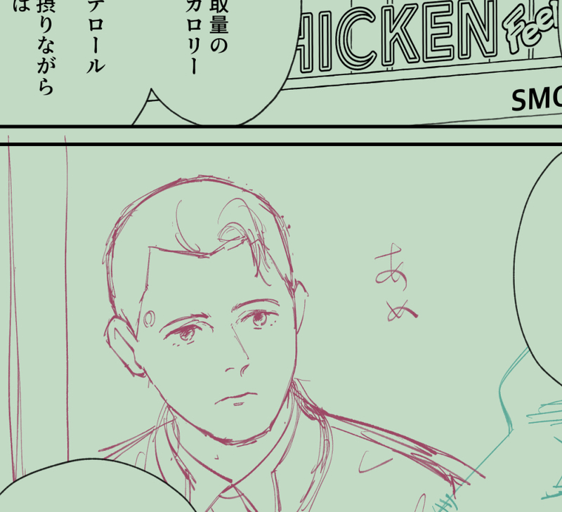 20230305 背景がしんどすぎる。何か変だと思ったらこのコナー君ホクロ描き忘れてた。下書きだからいいんだけど、普段描いてるものがないと違和感すごいな