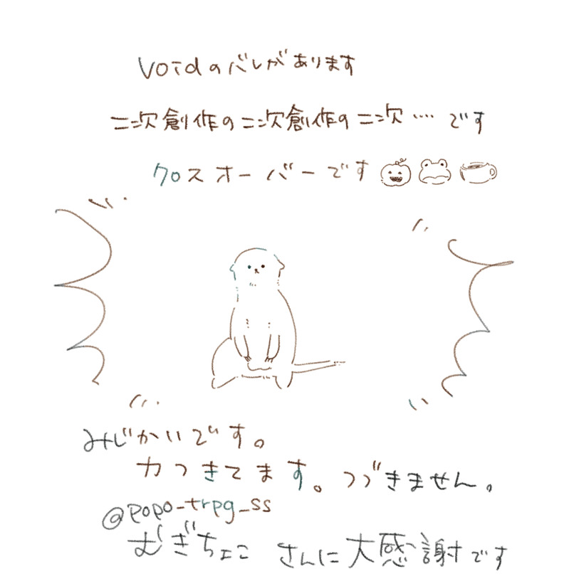 ねこがた☆quiet followDOODLEむぎちょこさんのツイートから勝手に考えて描いた絵です。刑事探索者が合宿してる、夜 目が覚めてしまった3人🎃🐸☕️がぽつぽつと話している、というツイートでした描き殴りなので読みにくいかもです show all(+1 images) Tap to full screen (size:1240x1263).Repost is prohibited Let's send reactions! freqpopularsnackothersPayment processing Replies from the creator Follow creator you care about!☆quiet follow ねこがたTRAININGえち、、な絵まとめ練習中順次追加 4 ねこがたSPOILER🧣5話RPバレ 瞳ガクガク 3:01:00- 2 ねこがたDOODLEブルキラ NPCバレ 幸せな絵#高ンゴにキラめいて バレ小栗さんと 2 ねこがたDOODLEりったまさん👼👿 3 ねこがたDOODLEむぎちょこさんのツイートから勝手に考えて描いた絵です。刑事探索者が合宿してる、夜 目が覚めてしまった3人🎃🐸☕️がぽつぽつと話している、というツイートでした描き殴りなので読みにくいかもです 2 ねこがたSPOILER #すとぬるに霧月タカヒロ DAY3・4及びcocシナリオ『LAST-0』のネタバレを含みますDAY1・2→(https://poipiku.com/4977095/9090539.html) 14 recommended works waiwai_waonSPOILER #すりっぷシャッハ#ぽんのうすりっぷシャッハ見て私の中のおたくがくすぐられた台詞〜🥳※一応ネタバレ注意※台詞曖昧 2 ま ゅSPOILER二枚目、Day3のネタバレあり🐍☂三枚目。Day4のネタバレあり🐸四枚目。Day4のネタバレあり🐸🐍☂ 4 ぬぅんDONE #中高症候群 ※NPCもいます ここの掛け合い好きすぎて一生聴いてられました。 Nnn_d12DONE今夏の学パロ 4 ささがわDOODLE♨️🐥🐥🐥 ueT208DOODLE #たかンゴっぷ旅館1日目のわちゃわちゃのらくがき。ネタバレ注意! ueT208DOODLE #たかンゴっぷ旅館2〜3日目のネタバレらくがき。最高のセッションでした 3 ま ゅSPOILER #白宮タカヒロVOID part1・part2、のネタバレを含む落書きFApart4→https://poipiku.com/5324011/7787333.html 9 meiccolovemisoSPOILER #高ズム果てにて二人のやりとり可愛すぎてたまらんかった。。。