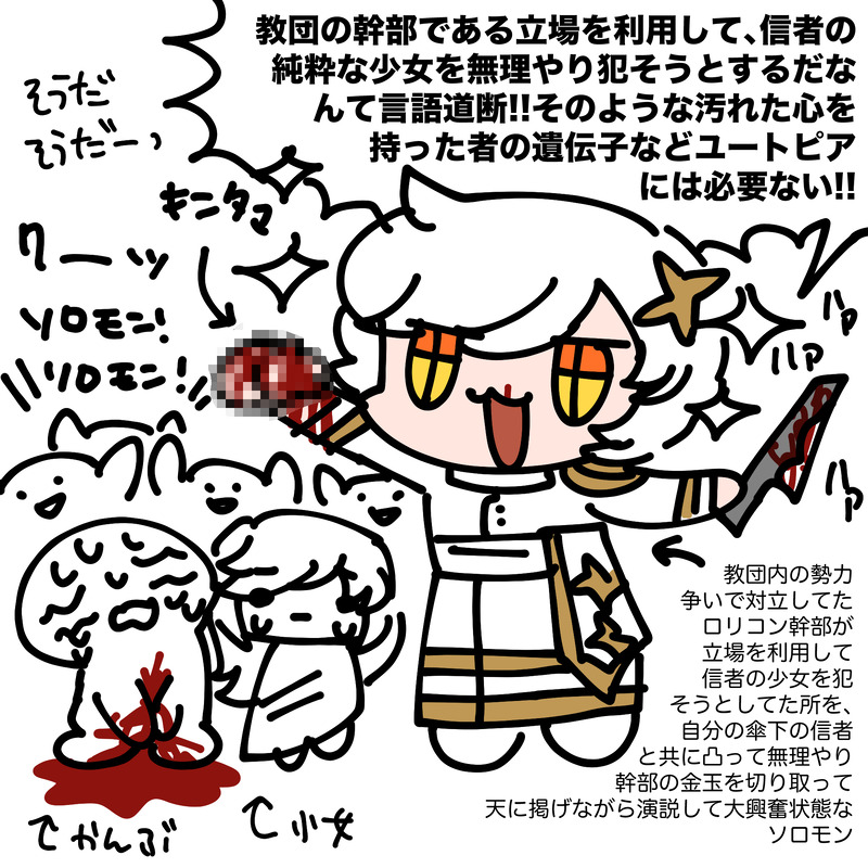 創作内のイかれたカルト教団なんだから内ゲバで金玉切り取ってそれを天に掲げながら演説する神父がいてもいいよねって絵