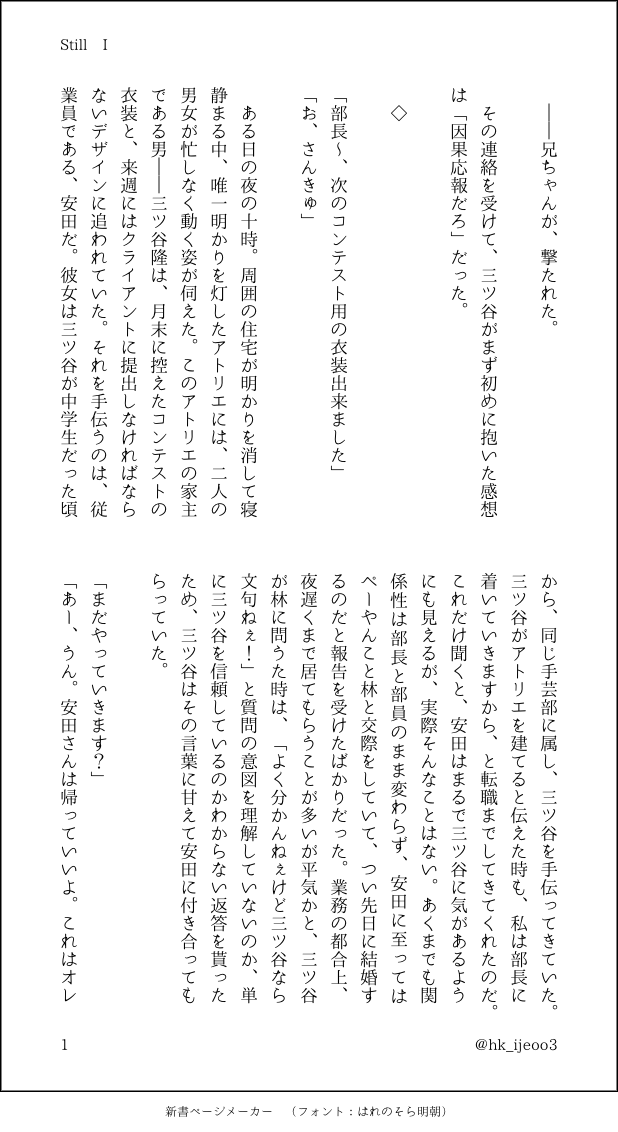 hk_ijeoo3☆quiet followPROGRESS『Still I』サンプルという名の作業進捗✌🏻らみぱ展示予定の1作品めですが、だいたいこんな話ですあと1ヶ月もないのにまだひとつも完成してなくてやべー!の気持ちなのでケツ叩きに作業進捗載っけてみました。 #蘭みつ ranmitu show all(+4 images) Tap to full screen (size:618x1132).Repost is prohibited Let's send reactions! freqpopularsnackothersPayment processing Replies from the creator Follow creator you care about!☆quiet follow hk_ijeoo3PROGRESS『Still I』サンプルという名の作業進捗✌🏻らみぱ展示予定の1作品めですが、だいたいこんな話ですあと1ヶ月もないのにまだひとつも完成してなくてやべー!の気持ちなのでケツ叩きに作業進捗載っけてみました。 5 hk_ijeoo3MOURNINGソルティドッグ蘭みつに使った表紙。折角PREQUEL使って表紙っぽくしたので置いとく hk_ijeoo3SPOILER読了後推奨。蘭みつ百物語で上げた『夢現』に関する押収品達を撮ってみた(※二枚目血糊注意) 2 hk_ijeoo3DONEToo So Badのおまけのえろ。横書きがいい人はべったーへ。 9 related works Hana_Sakuhin_MOURNING蘭みつ♀ キリは良いですが、未完成の作品です! 4317 li10todorokiDOODLE監禁されてるけど監禁の定義覆していくスタイルのパワフルな🍯となんだかんだ🍯に甘い灰谷兄弟的なネタ……ベランピングしてて欲しい(ゆ/る/キャン/△に触発された)アナログ仕様 2 li10todorokiCAN’T MAKE蘭みつ漫画、支部掲載予定が一向に完成しなくてむしゃくしゃして……気づいたら蘭みつなのか最早謎なちょいエロ緊縛?1P漫画が作成されてました(˙꒳˙*?)オヨ?続きは描けなかったので供養……🗝18歳以上?yes or no 2 ちかさDOODLE蘭みつ♀ 漫画にもなってないネタメモ落書き gettyaanDONE蘭みつ/セクピスパロ蛇の目重種×訳あり猫又中間種(ちょっと変えました)やっとできた〜〜〜!!! 日付変わったら支部にあげます匂わす程度の🔑🎋、本誌の話が前提なので注意 9732 masa_da5CAN’T MAKE寝バック蘭みつR18マロありがとうございます〜〜えろ擬音をどなたかレクチャーしてほしいです18↑?↓? yes or no gettyaanMOURNING蘭みつ/アイ💰×アイ💰パロ※某掲示板形式、モブが喋っているだけ(チャットに近いです、苦手な方はご注意下さい)お騒がせカップルな蘭みつ 4542 li10todorokiMOURNINGもってけ!とっこうふく☆Darkキサキを運営にしてみつを追い詰めた後掻っ攫う計画を立てたが🎍の奮闘により阻止されたので自分から積極的に攫いに行く事にしたran(多分天竺編でボコした後病院で治療受けてまだ意識が戻らないうちに奪取)からの閉じ込め⇒偶像には信者が必要と言う謎理論で閉じ込めたみつの写真を部下に見せ反応が良い奴はファンルート、東man側に情報リークする奴は泳がせて消すみたいな🗝yes ochayasan_DOODLE蘭みつ(梵ショタ⚠️無理矢理) recommended works otomeko_DOODLE女体化 コンカフェパロ 蘭みつ Hana_Sakuhin_DONE蘭みつ♀ / ツイートしたWDドレスネタあまりにも書きたくて殴り書き。1Hクオリティ。いつもよりご注意を。 1230 shigotopineDOODLEオクスリ使って春ちゃんをやっちまおうぜ 2 逆3角MOURNING蘭みつまとめ 2 shigotopineDOODLE甘々蘭はるです 2 li10todorokiPROGRESS台詞部分だけ、打ちこんだ版梵天関連の事件にたまたま巻き込まれてhitani兄弟に監視兼護衛として四六時中仕事からプライベート迄つきっきりにされてしまうみつの話蘭みつ、というか灰みつになる予定の書き掛けです 7 li10todorokiCAN’T MAKE蘭みつ漫画、支部掲載予定が一向に完成しなくてむしゃくしゃして……気づいたら蘭みつなのか最早謎なちょいエロ緊縛?1P漫画が作成されてました(˙꒳˙*?)オヨ?続きは描けなかったので供養……🗝18歳以上?yes or no 2 ろくとDOODLE蘭はる。🔞🈲へぇたにが💊にちんピアスプレゼント🎁した。Pass🔑18↑?【yes】or【no】 _eraichanINFO9/22発行のアルカヴェ新刊BEYOND THE NIGHT, BEYOND THE LIGHTの細かい設定と構想メモ絵です 5
