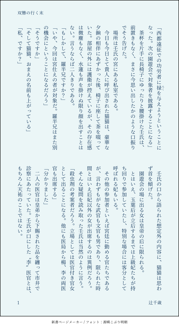 辻千歳(CTS🌙)☆quiet followDOODLE2月頃に書きたいところだけ書いたまま放置していたら初心を忘れてしまい、着地点がよく分からない話に。青薔薇の園遊会で壬氏がつけてる簪、冬の園遊会で猫猫にあげたやつと同じでは?という気付きから。意匠はBGもしくはアニメ版を踏襲しております。細かいことは気にしないで下さい…… show all(+10 images) Tap to full screen (size:618x1132).Repost is prohibited Let's send reactions! freqpopularsnackothersPayment processing Replies from the creator Follow creator you care about!☆quiet follow 辻千歳(CTS🌙)DOODLEなろう後始末編「四、大猫」の冒頭部の猫猫の懸念に対する壬氏の思惑についての考察。文庫16巻となろうをごちゃ混ぜにしてます。甘くない。 2 辻千歳(CTS🌙)DOODLEブルスカでの投稿より。でもちょっと違う感じになった。多分これは初めて味わってしまった壬氏。ぬるいですが一応18歳以上でお願いします。口淫後ごっくんされた攻め(便宜上)が受け(同)にキスするのがめちゃくちゃ好きなんですよね。キスしたい欲求が自分の精を口にする嫌悪感を上回るところが非常に好き。なのによくよく考えたら拙作ではまだ口淫してない!となったので脱稿したらしていただきます。 辻千歳(CTS🌙)DOODLE2024/9/28なろう版「告白 表」の投稿を受けて傷心した結果の妄想ツイより。次話。客観的な描写にしたいのでオリキャラが出てきます。まだ続きます。もう別れざるを得ない場合、皇帝になった壬氏と後宮医官になった猫猫でまた謎解きをすればいいよ…二人とも愛し合っていることをひた隠して、医局でお茶飲んだり事件解決したりするけど、一線だけは絶対に超えない超絶プラトニックラブを見せてくれる… 4 辻千歳(CTS🌙)DOODLE2024/9/4ファイル整理していたら書きかけを発掘。最後加筆したのであげ〜いつぞやのワンドロのお題【妖怪】をお借りしています〜!(仙人ですが妖怪のくくりで笑)お年を召したお二人です。 4 辻千歳(CTS🌙)DOODLEまたオチのない話を。かっこいい壬氏くんを目指しました!壬猫婚姻済で真名表記ですが、猫要素ほぼなし!有能な高順が好きなんですが、彼の有能さを表現する力量がない😂皇族に対する謙譲語が難しすぎてググってみるもののピンとこず。いつも通り雰囲気ばなしなので、諸々ふわっと読んでいただければと。 7 辻千歳(CTS🌙)DOODLE2023/10に薬屋にハマって一番最初に書いたもの。この二人なぜ結婚していない???と混乱した結果、くっつけようとした模様。展開が面白くなくて没にし、pixivの下書きに眠っていたけど、サイバー攻撃受けるかも?という噂によってサルベージされた。設定厨らしく後々のためにタネをまいた形跡があるものの、続きはない。 10 recommended works なつこTRAINING 4 catsfreaknokyoPAST2019年に初めて書いた壬猫SSです catsfreaknokyoPASTワンドロお題「嫉妬」 4 catsfreaknokyoPASTワンドロお題「幼少期」捏造if 2 catsfreaknokyoPASTどのジャンルでも一回はやりたい「恋の病」 4 nenecon2024PAST無双タグ参加記念♪ 2 Mooi_FeiDOODLE下方来自珍咪 𝕂𝕒𝕣𝕚𝕟DONEちぎりんお誕生日おめでとう🎉🥳 2 kei48279308MOURNING寫於神樂鉢連載62回後。座村父女過去捏造。イヲリ=伊織(非正式確認之翻譯名稱) 1273