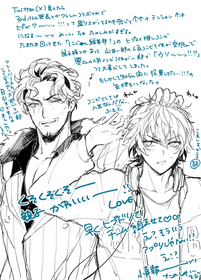 最近めちゃめちゃ絵描きたい欲が爆発してるので、消化できてなかったものバンバン描きたい。ソロ曲発表~3rdバトル開催まで決まって、楽しみが多すぎてやばい。更新出来てなかった時期長かったのにスタンプ押して貰えててメチャメチャ有難い。ありがとうございます。カプに萌えて絵を描く行為…どうしても孤独で寂しいが付き纏うのに、、狂っているから描きたい…好きで描いたので見て貰えるの嬉しすぎる///
