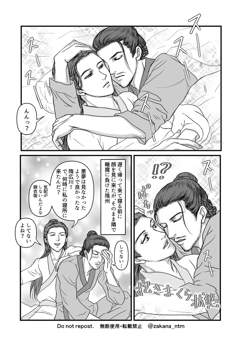 錦衣衛は気配を消すのが得意、起こさないように気を使って寝所に来たら怒られた朝(自分の部屋で寝ようとは思っていたらしい寝落ち隋州)。