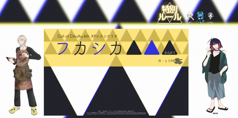 utsm_sta☆quiet followINFOCoC「フカシカ▲▲」(KPレス)作者*とりPRO様PC/PL東雲 玄希/空蝉蛍原 聖/ヨルさん両生還にてシナリオエンドでした!ありがとうございました!!ソプほよん同士で行ってきました!楽しかった!!ツッコミ不在 ##通過報告 Tap to full screen (size:3950x1957).Repost is prohibited Let's send reactions! freqpopularsnackothersPayment processing Replies from the creator Follow creator you care about!☆quiet follow utsm_staINFOCoC「破邪神鏡」HO4:責務を担う専門家名前:播田 晶(はりた あきら)性別:女年齢:25身長:151cm職業:考古学者明日!!破邪神鏡に行きます!!立ち絵立ちました!!!行くぞーーー!! utsm_staINFOCoC「IN THE ROOM」作者*魚交 様KP*空蝉KPC*八咫PC/PL因幡 素/杏狐さんエンドBにて両生還!ありがとうございました!!! utsm_staINFOCoC「Night Deep Blue」作者&KP*りくも様PC/PL片平 和泉/えーちゃん鈴宮 リン/空蝉エンドAで両生還!ありがとうございました!!このシナリオ楽しいかわいいし地味に嫌な気持ちになれる utsm_staINFOCoC「えっ?手のひらから唐揚げ出せるんですか?」作者&KP*りくも様PC/PL片平 和泉/えーちゃん鈴宮 リン/空蝉両生還にてシナリオクリア!ありがとうございました!!笑いすぎてお腹痛い utsm_staINFOCoC「アンダーテリング」作者*ぶんどき様KP*のらいぬさんPC/PL渡会 紅/空蝉砌 弥彦/Lyuさん両生還でシナリオクリアでした!!ありがとうございました!!!!! utsm_staINFOCoC「太陽と月と眼」作者*春野おかず様KP*杏狐さんKPC*ロイ・デズモンドPC/PLカメリア・アイレクス/空蝉置き卓でアメリカ人達の邂逅をしました!!ネグレクトのロイくんと被虐待児のカメリア。仲良くなれたらいいね。 recommended works ltiR4RXAcctlsWeDONEいずレオ・プロステートチップえちちpart2。(注意・BL・2次創作です。)甘々えち。プロステを実物を見たことがなく、本を読み、衝撃を受け、想像と妄想で描いてます。質問・BLです。OK?…パスワードはOK 13 nokonokoDOODLEらくがきのマフィアパロ(敵対) そんなにエロくないので気持ちはR15パス▶︎18↑(yes) 2 utsm_staINFO #空蝉の探索者名簿 CoC「DOGMA」HO1:正義の復讐者名前:八咫(やた)来週からDOGMA!初めての暗黒の祖先PCですやったー!へらへら最悪お兄さんで行くぞ!よろしくお願いします!! 2 utsm_staINFO #空蝉の探索者名簿CoC「真夜中は恋人」名前:百合谷 騎星(もまえだに きら)金曜夜からまよこい!KPCの騎星は愛兎。(らびっと)名義でガチ恋配信者をしてるapp17!よろしくお願いします!! utsm_staINFO #空蝉の探索者名簿CoC「デッドエンド・キラーサイト」HO:殺人鬼名前:華蓑 笠子(はなみの かさこ)明日からデッキラ!楽しみ!!恋する殺人鬼笠子ちゃんと言ってきます!新しい恋と会えるといいな🎶 utsm_staINFO #空蝉の探索者名簿CoC「君を土に埋める日」名前:グリップ阪本(本名:阪田 本次郎)売れないピン芸人がゆく君埋めは明日から!よろしくお願いします!! utsm_staINFO #空蝉の忍者絵巻シノビガミ「洋菓子秘伝忍法帳」PC4名前:千方 桜子(ちかた さくらこ)流派:隠忍の血統今日から!ママで挑んでいます! tamayura830DOODLE※玄武洞から帰った江澄を 労り損ねる楓眠…があったら良かったなという妄想…2024年12月22日 3 500ml缶コーラDOODLE体調が良くないよ